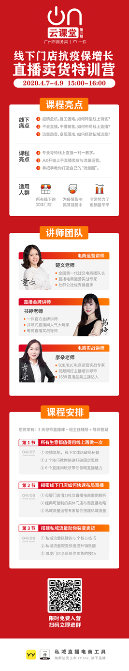 另外,YY一件已加入广州市商务局云课堂体系,推出疫情困境下实体门店如何转型、开展线上直播卖货的系列培训课程,通过云课堂的形式让广大商家了解直播的内涵、技巧、特点,提高商家的直播水平,共享直播红利。