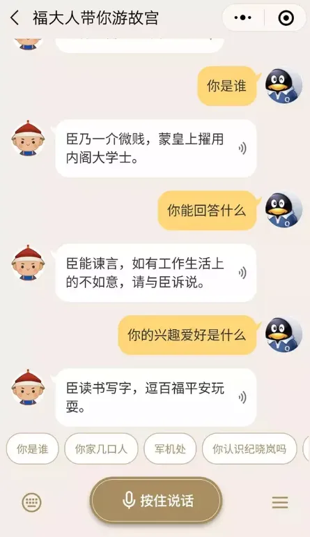 说起AI导游,不得不提到故宫AI导游“福大人”。同样的,他也是故宫品牌人格化的体现,以钦差大人的形象生动的为用户解答各种疑问,互动内容保留了自己的品牌形象,平易近人的对话方式极大的拉近了和用户之间的距离。
