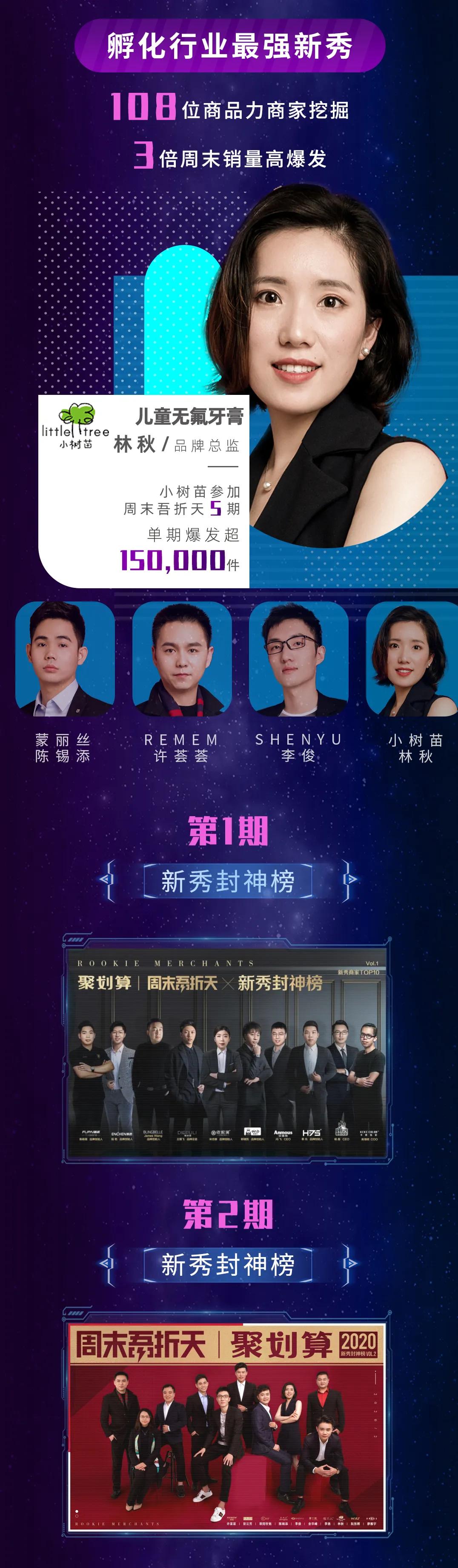 当然,除了通过平台本身黏性及数据支持,周末吾折天还致力以定向带动的扶持方式,助力新秀商家破圈,强势拉动各品类行业中最重点的企业对象,打造出最强出圈的中小型品牌商家108将。