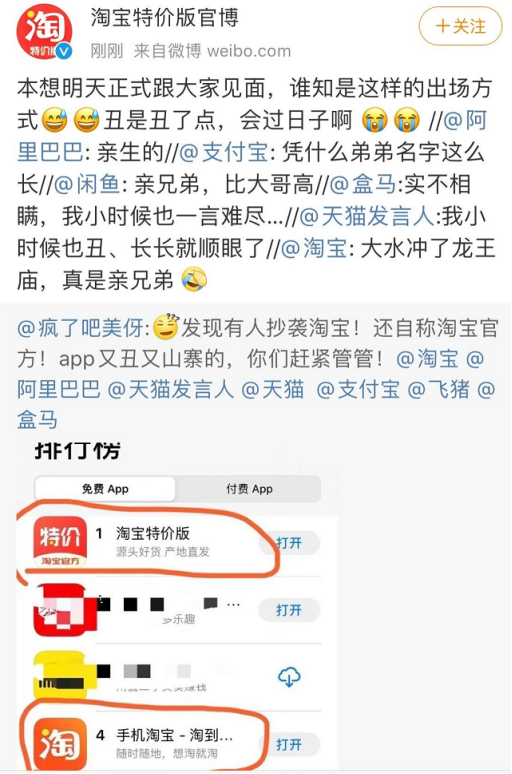 本以为是一场正义的“打假”微博,没想到却打乱了淘宝特价版APP的正式出场计划。随后淘宝、天猫、闲鱼、支付宝等众多官方大V顺势纷纷下场回应,坐实“丑儿子”的真实身份。