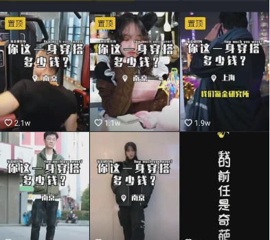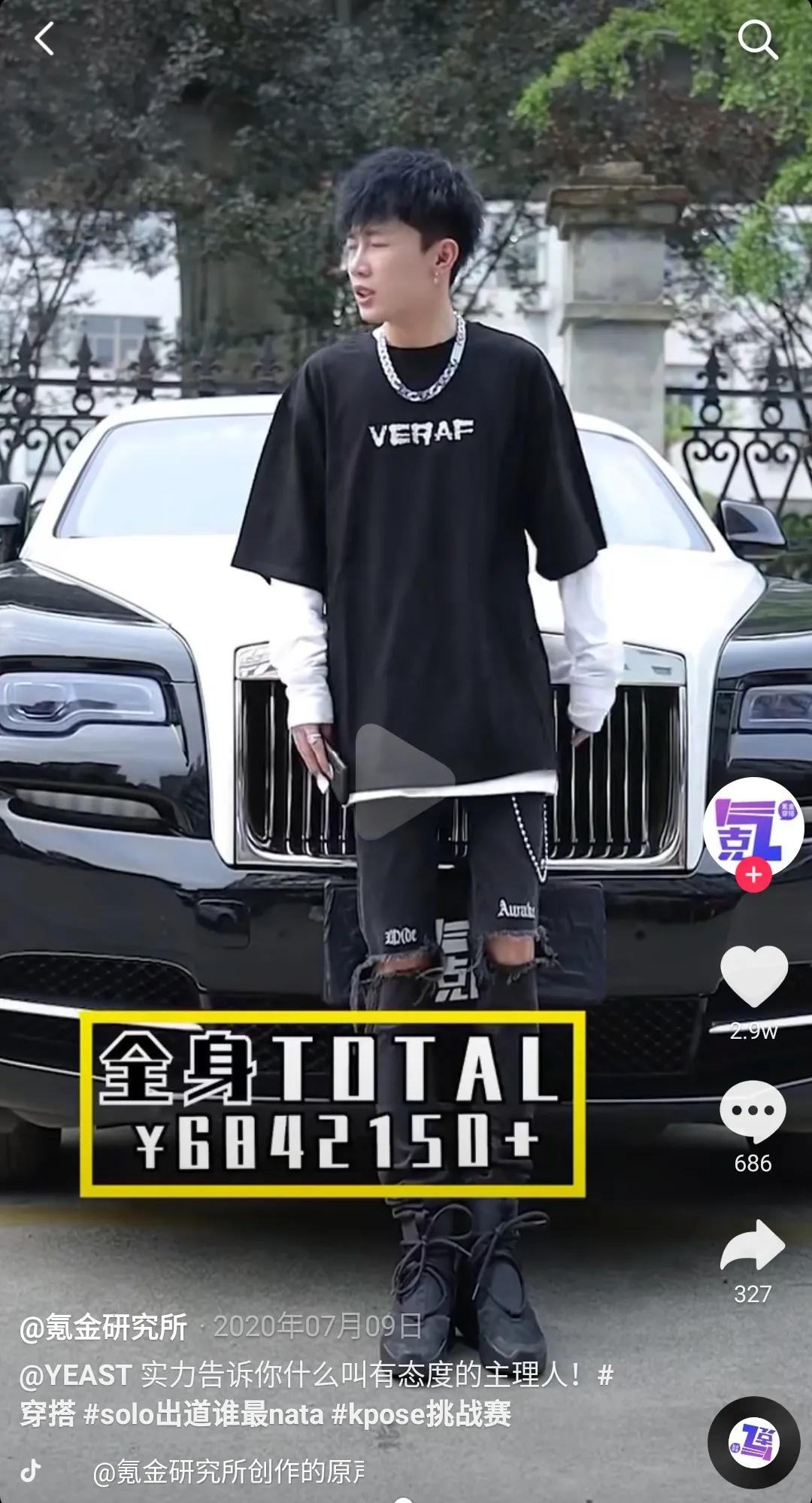 还有一批刚出校园或还在读书的小年轻,通过显摆身上的穿搭,来获吸引粉丝。@氪金研究所几乎每个视频,都是通过采访形式,展示年轻人的穿搭价值,有的还直接把豪车开出来。