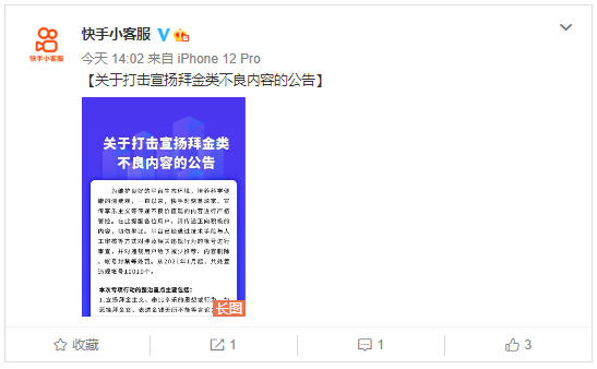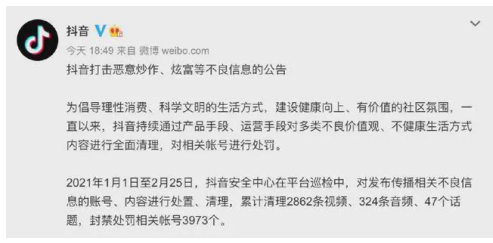 但是,炫富毕竟在引导一种不正确的消费价值观,引导年轻人通网贷来满足炫耀的心理。因此,对于平台来讲,炫富内容是一把双刃剑,如果平台没有调控好,不仅影响产品调性,而且容易受到监管部门的处罚。而前段时间,抖音封禁了4000个炫富帐号,快手也在微博发声:打击拜金炫富内容,处置违规账号10010个。