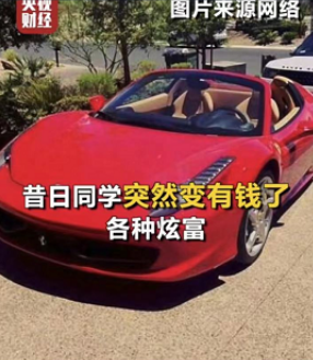 还有一些晒豪车,一般是为汽车用品或装饰做品牌推广的。而观众购买这些产品时,根本不看质量,一般是冲着“有钱人”的身份去消费,就像年轻人为自己的爱豆代言的产品买单一样。昔日同学高调炫富,实为“诱饵”来“杀熟”,就是通过炫富,勾起人的好奇心,然后传授赚钱途径,进而进行骗钱。