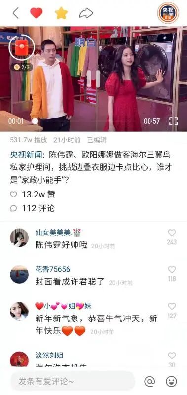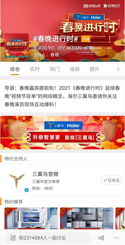 我们所理解的电视屏与移动小屏在品牌营销中并非割裂的存在,通过央视春晚的大屏热度奠基,海尔三翼鸟在移动小屏上借助直播、微博话题讨论、蓝V助力、明星打Call等策略,实现与社交平台无缝衔接与流量热度引爆。海尔三翼鸟与#春晚进行时#、春晚、新年等关键词紧密捆绑,获得超高曝光与互动,而@央视新闻、@春晚、@微博综艺等高影响力大V强强联合,持续发博推广节目和海尔三翼鸟品牌,助力品牌强势传播并吸引海量关注。