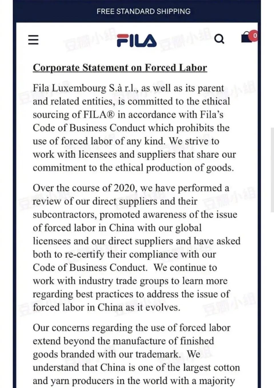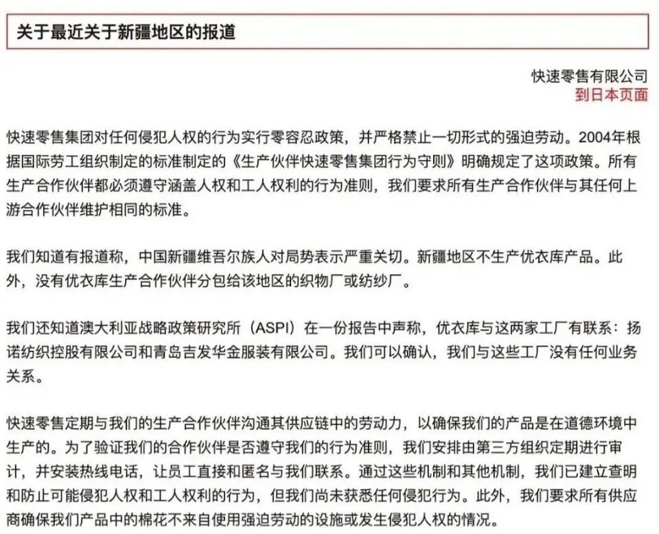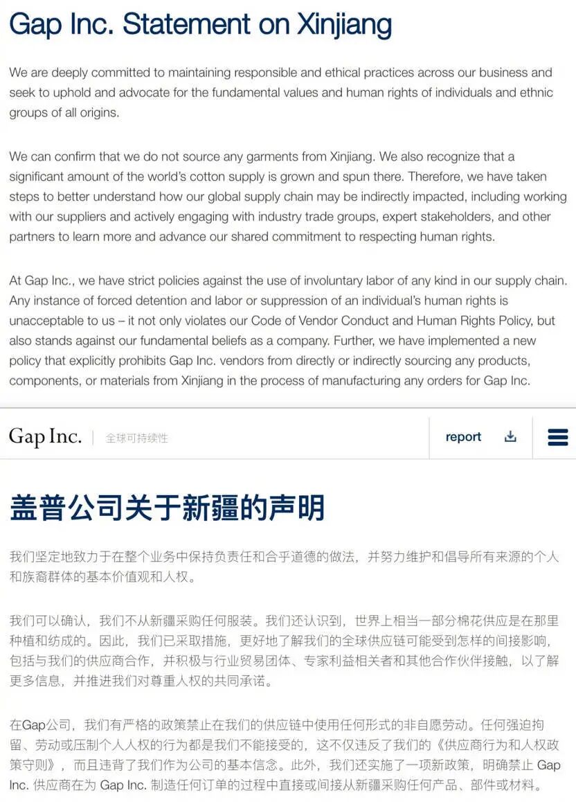 3月24日,H&M集团在网站发布了一份声明,主要内容有:“H&M集团对来自民间社会组织的报告和媒体的报道深表关注,其中包括对新疆维吾尔自治区少数民族强迫劳动和宗教歧视的指控。”“新疆是中国最大的棉花种植区,到目前为止,我们的供应商从该地区与“更好的棉花计划”(BCI)相关的农场采购棉花。由于在该地区进行可信的尽职调查变得越来越困难,BCI已决定暂停在新疆发放BCI棉花许可证。这意味着我们产品所需要的棉花将不再从那里获得。”