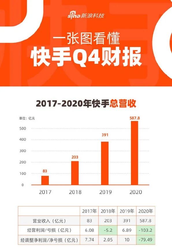 如此劲爆的标题,再配上网站首页的来回滚动,很快就在网上引发热议。吃瓜群众更是看热闹不嫌事大,各种质疑声、批评声也此起彼伏。然而细扒其财报才发现,一些媒体为了追求发稿速度,看到财报中“全年净亏损1166亿元”就误以为是实际亏损,其实财报的详文中还有进一步的解释。摒弃掉晦涩的专业术语,通俗的说就是, 2020年快手的经营亏损实际为103亿元,经调整后为亏损79.48亿元。亏损数额骤减,加之去年受疫情影响不少公司都出现了业务断崖式下滑,从这个角度来看,快手这个成绩是不是能勉强说得过去?