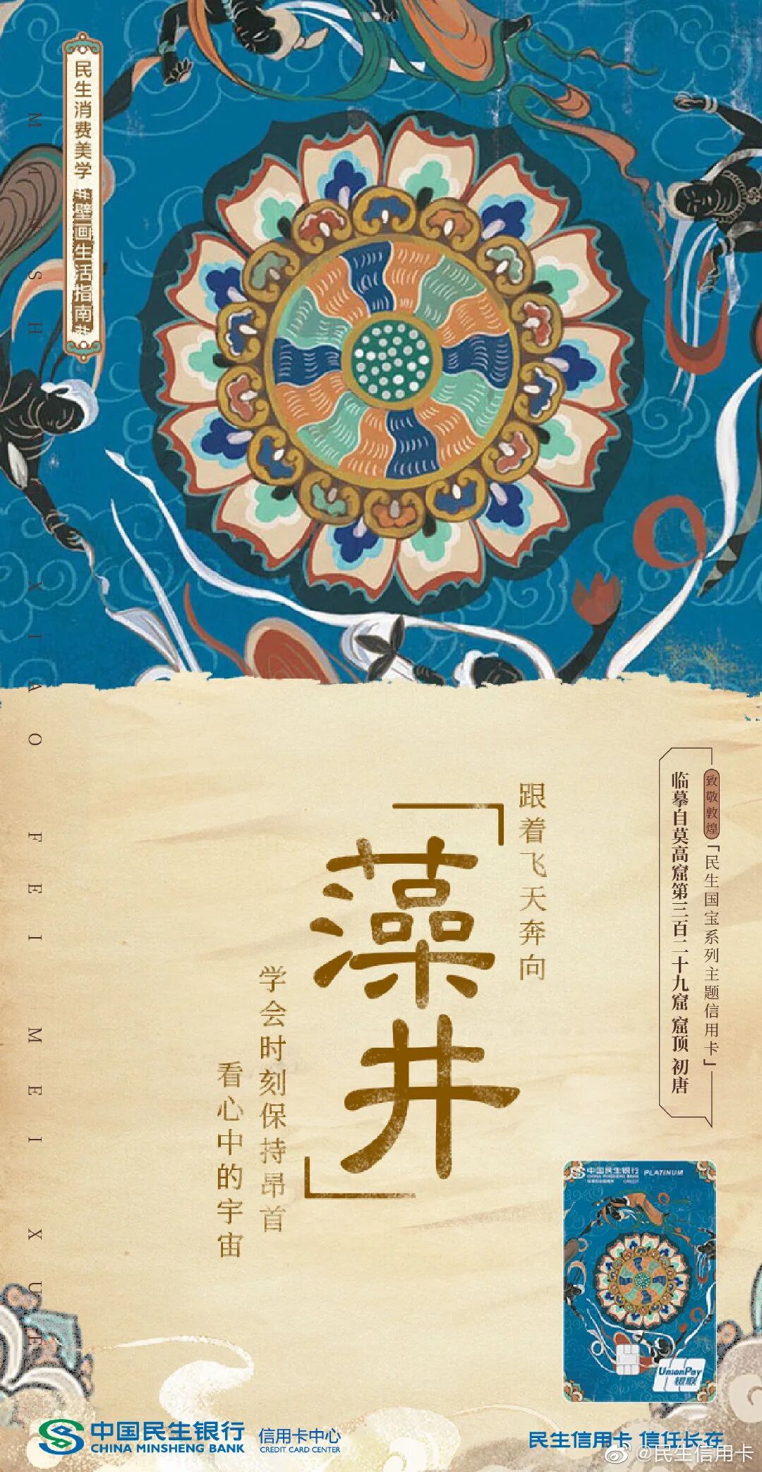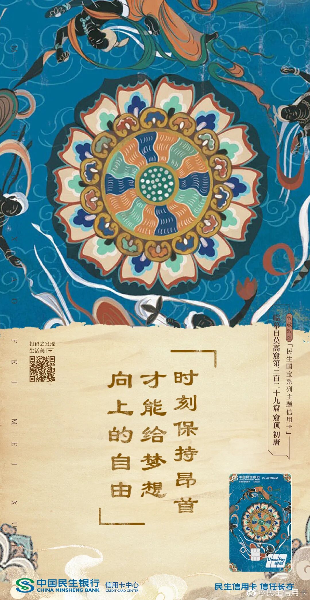 民生信用卡联合敦煌博物馆定制联名卡,借助敦煌壁画中古人生活智慧加持,传敦煌艺术之美,承古今文化之忆,实现传统美学与现代意蕴的碰撞,给予消费者全新的美学体验: