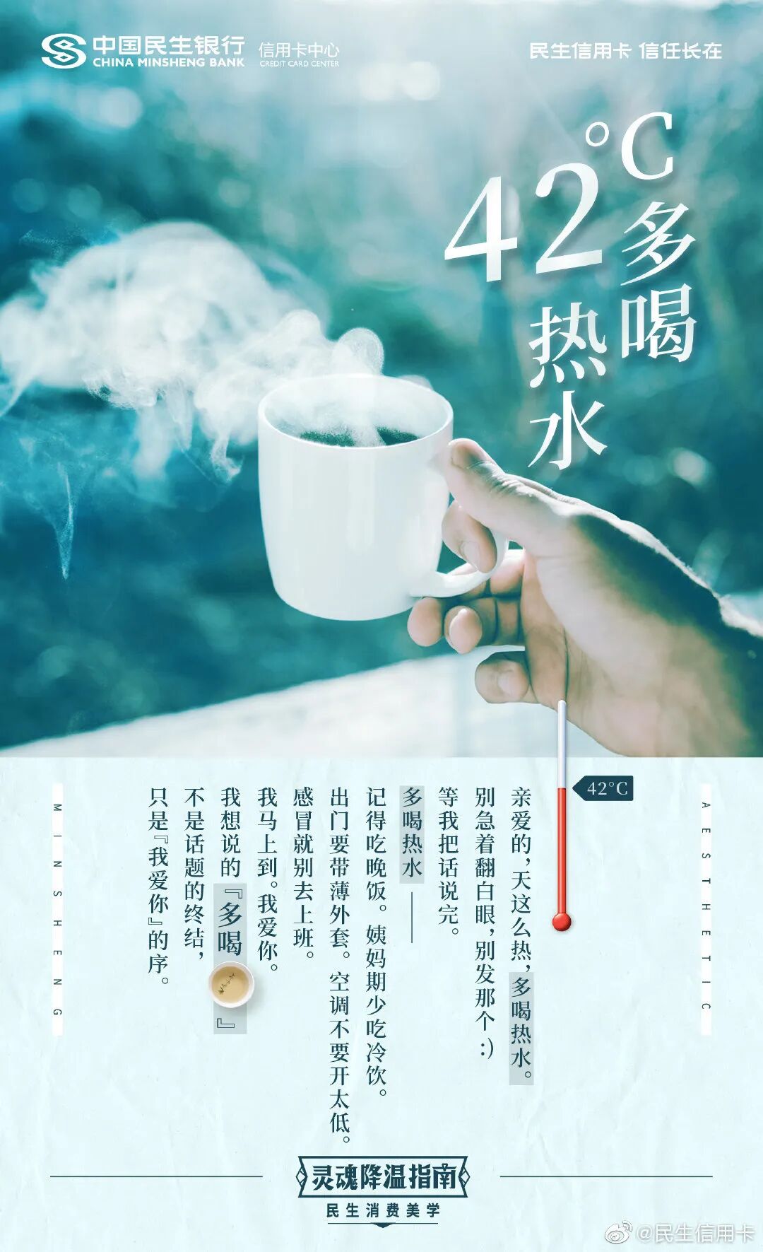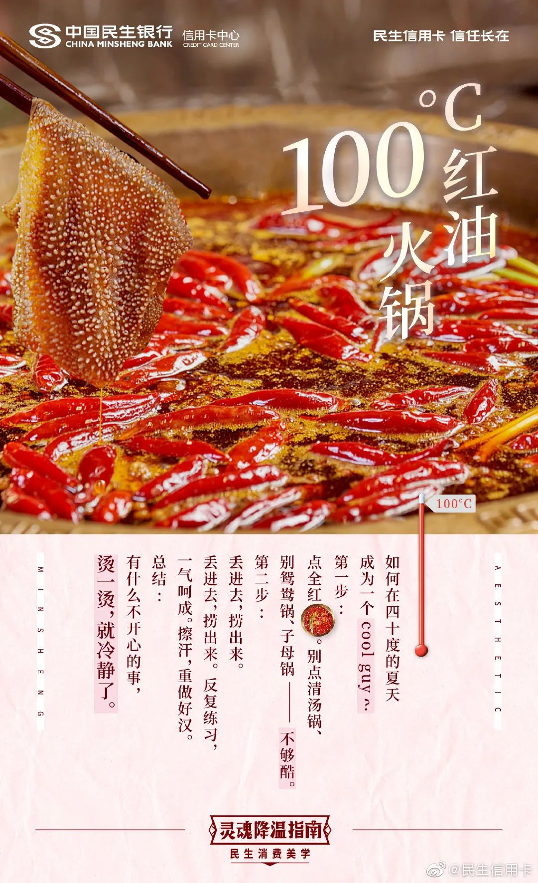 每到夏天身上总是感觉黏糊糊、油腻腻,当大家都对夏天的高温避而远之的时候,民生信用卡却企图用美学,刷新你的夏天观。比如100℃的红油火锅、42℃热水等,把抽象的夏日温度具体化、生动化,带你发掘夏天的美好时刻,原来夏天的高温也并不可怕。
