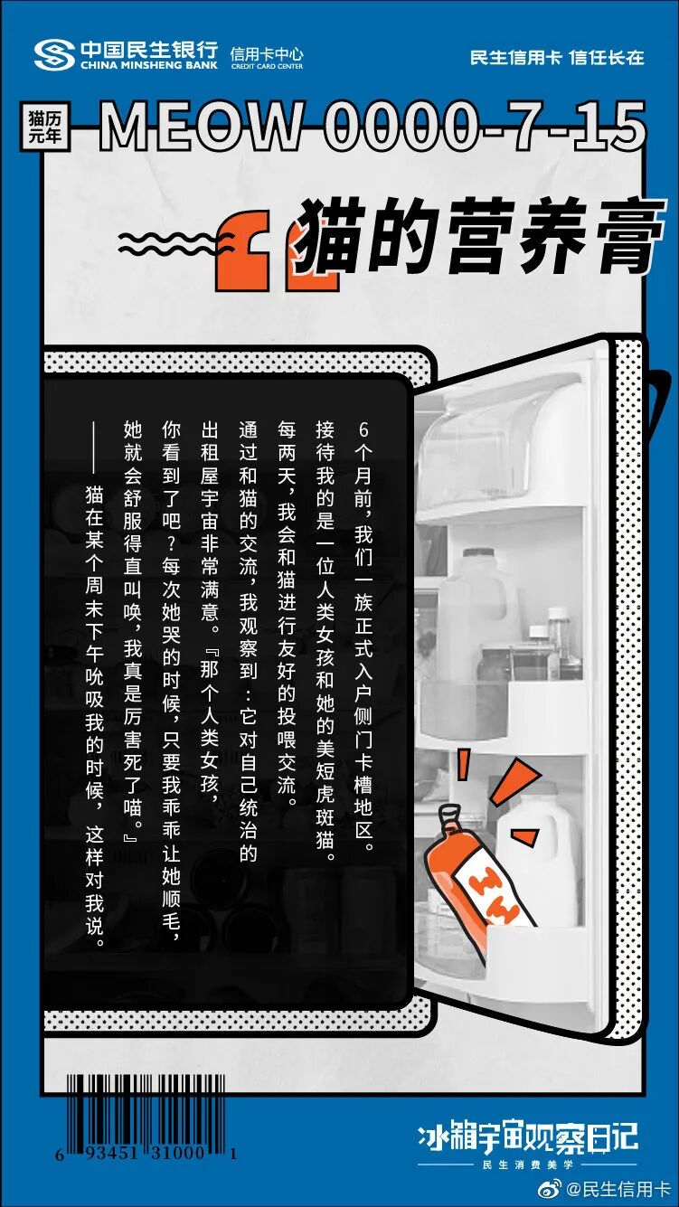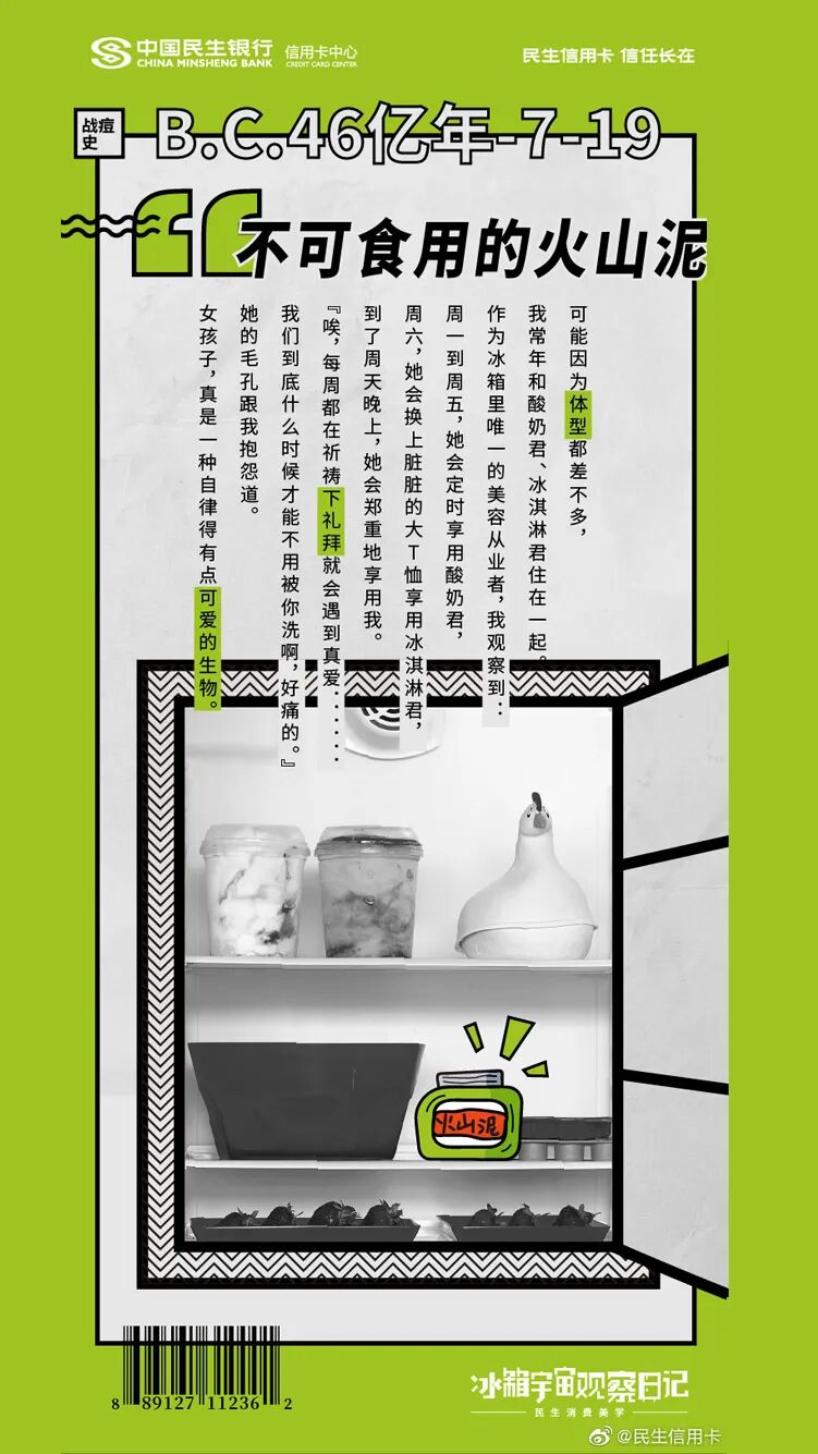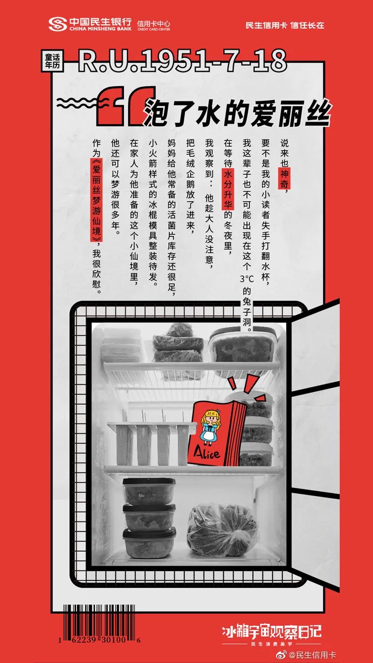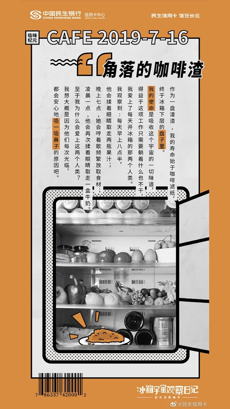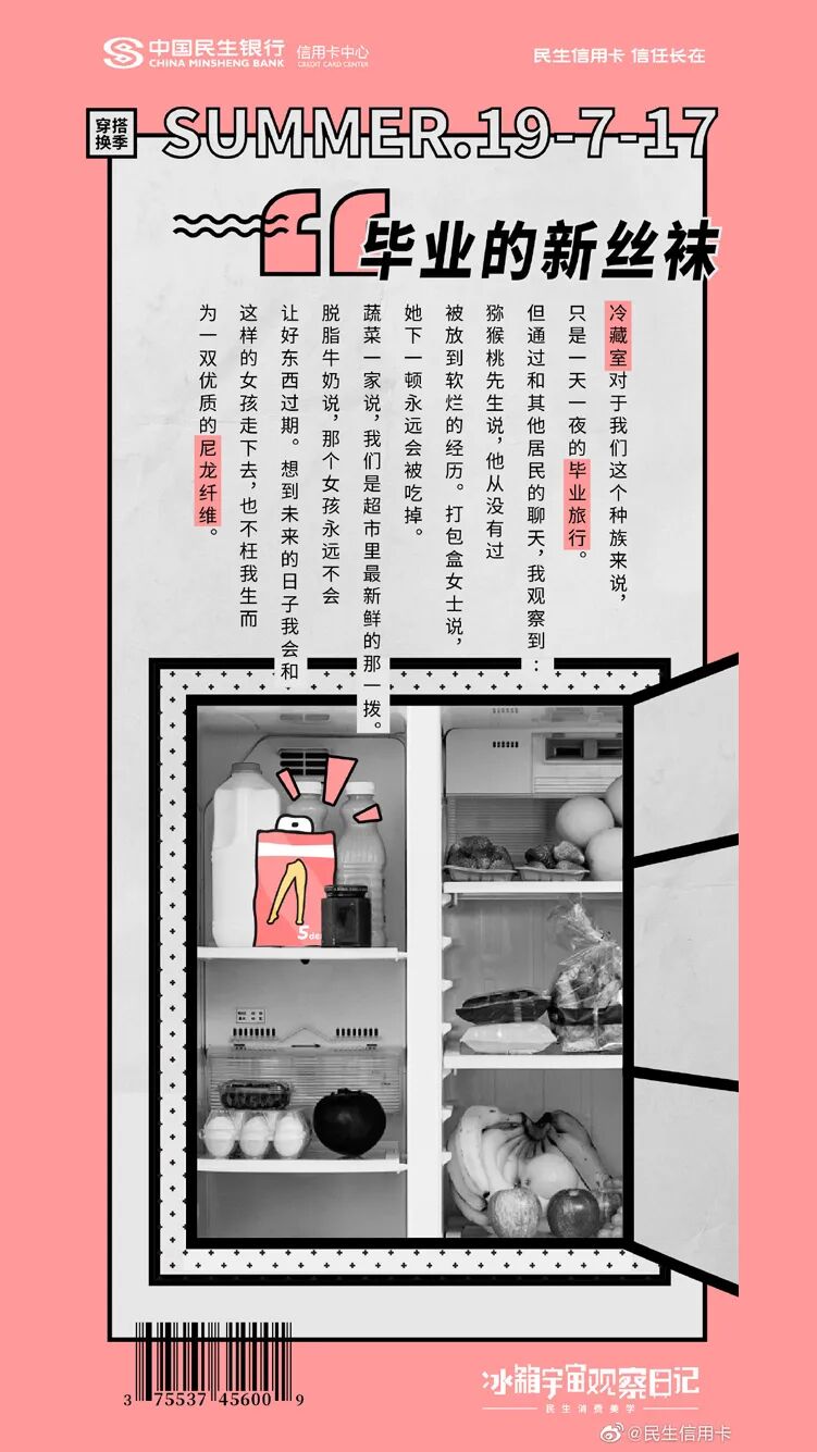民生信用卡还从冰箱入手,以冰箱为走心的沟通场景,将冰箱里的食物拟人化。它们可能是角落的咖啡渣、也可能是泡了水的爱丽丝,毕业的丝袜......这些食物躲在冰箱里,偷窥着主人的生活日常一举一动,记录主人日常生活中美好片刻。相对于让消费者做自己的“主角”,由冰箱食物发声的创意,更能从侧面展现品牌对消费者贴心的一面。