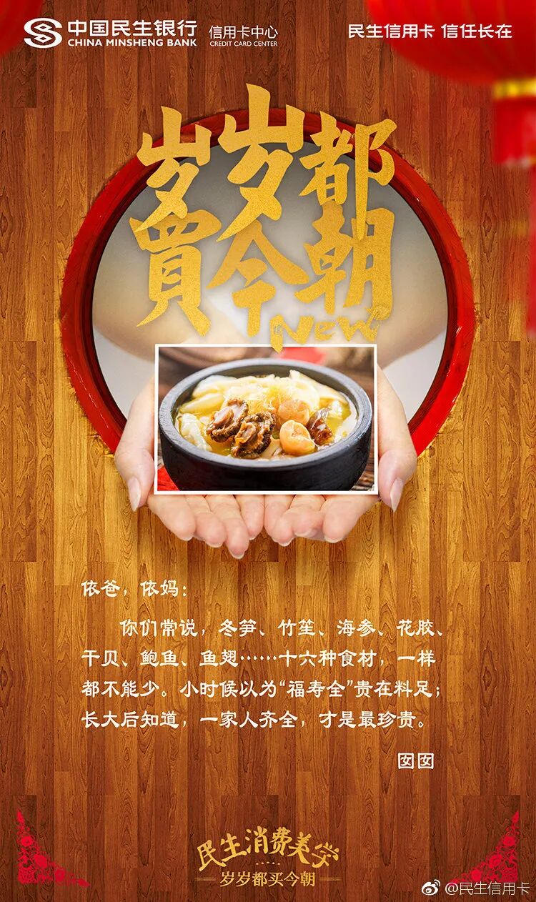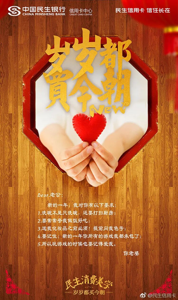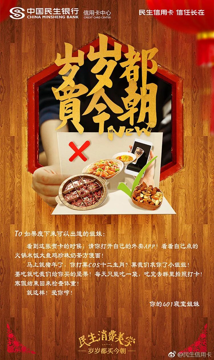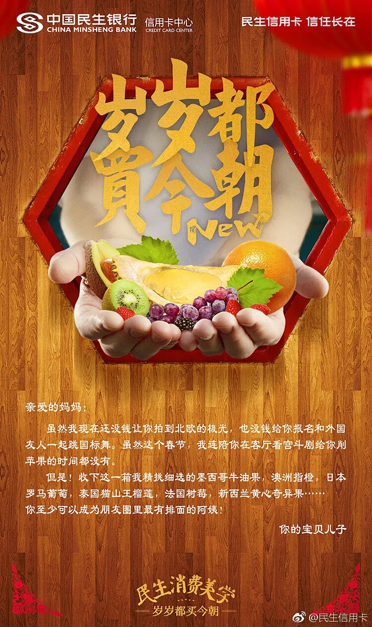 不止于自己秀文案,民生信用卡还擅长借用民间文案高手创作。比如借势春节送礼话题,玩转用户UGC。以书信海报为载体,从妻子、闺蜜、儿子等视角出发,在线给亲朋好友送礼,寄托一份相思。见字如面,纸短情长,民生信用卡把用户的真实UGC内容作为广告文案,赋予普通的春节祝福,更多的生命力。