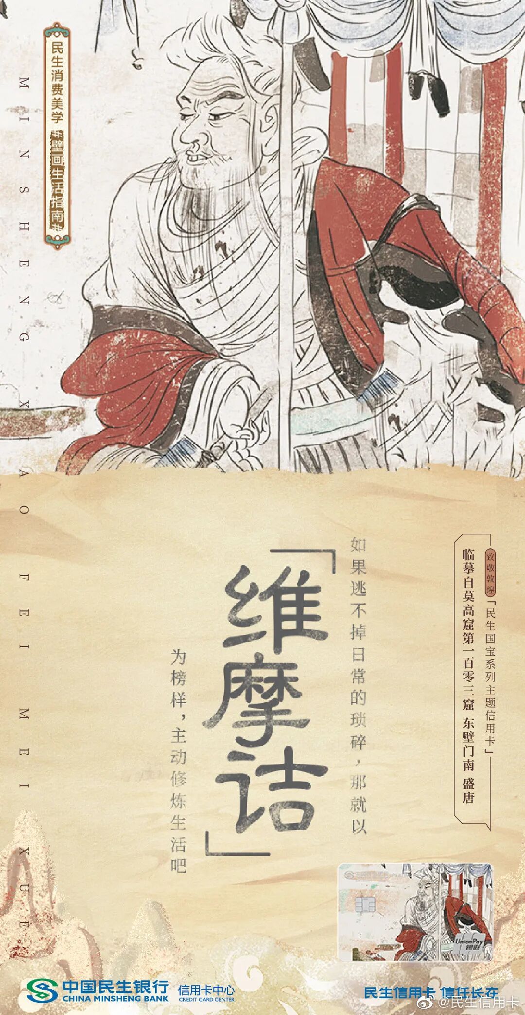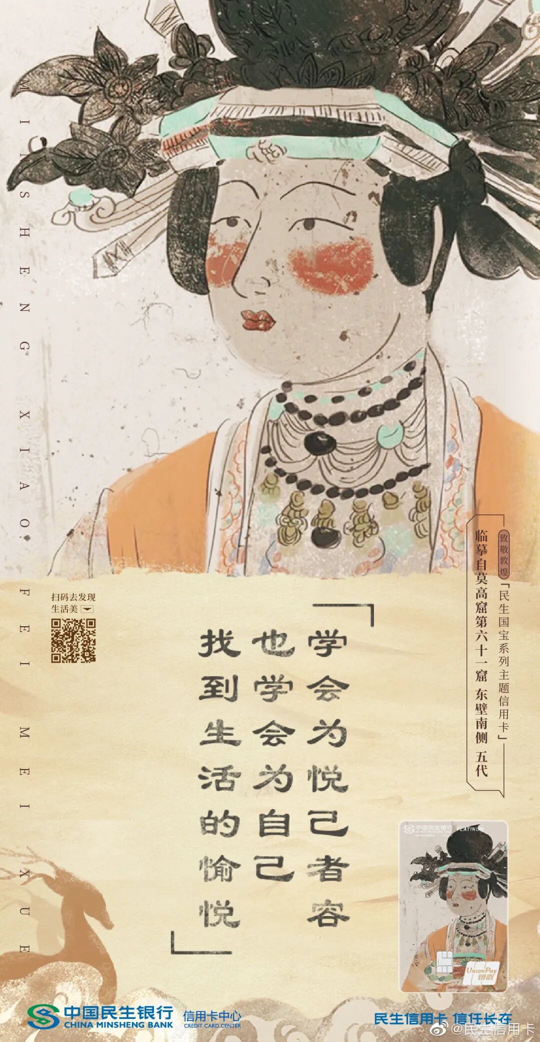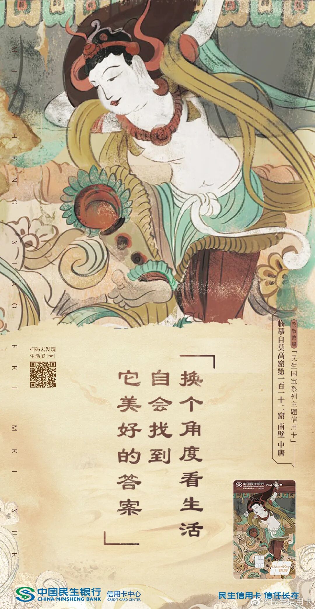 敦煌壁画艺术的精髓不止是美学风格,还是一种精神生活哲学。民生信用卡之前与敦煌合作,也借用伎乐飞天、反弹琵琶壁画,传达出对生命的礼赞,劝你把生活过成一首诗、一首歌,学会修行沉淀自己。