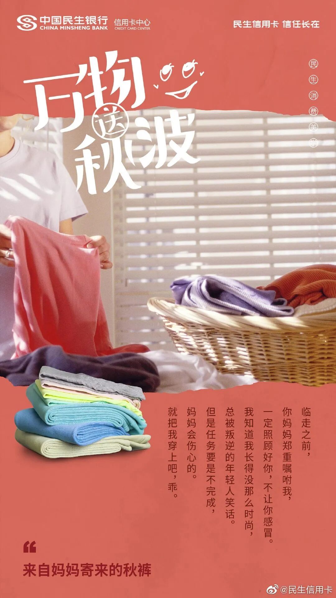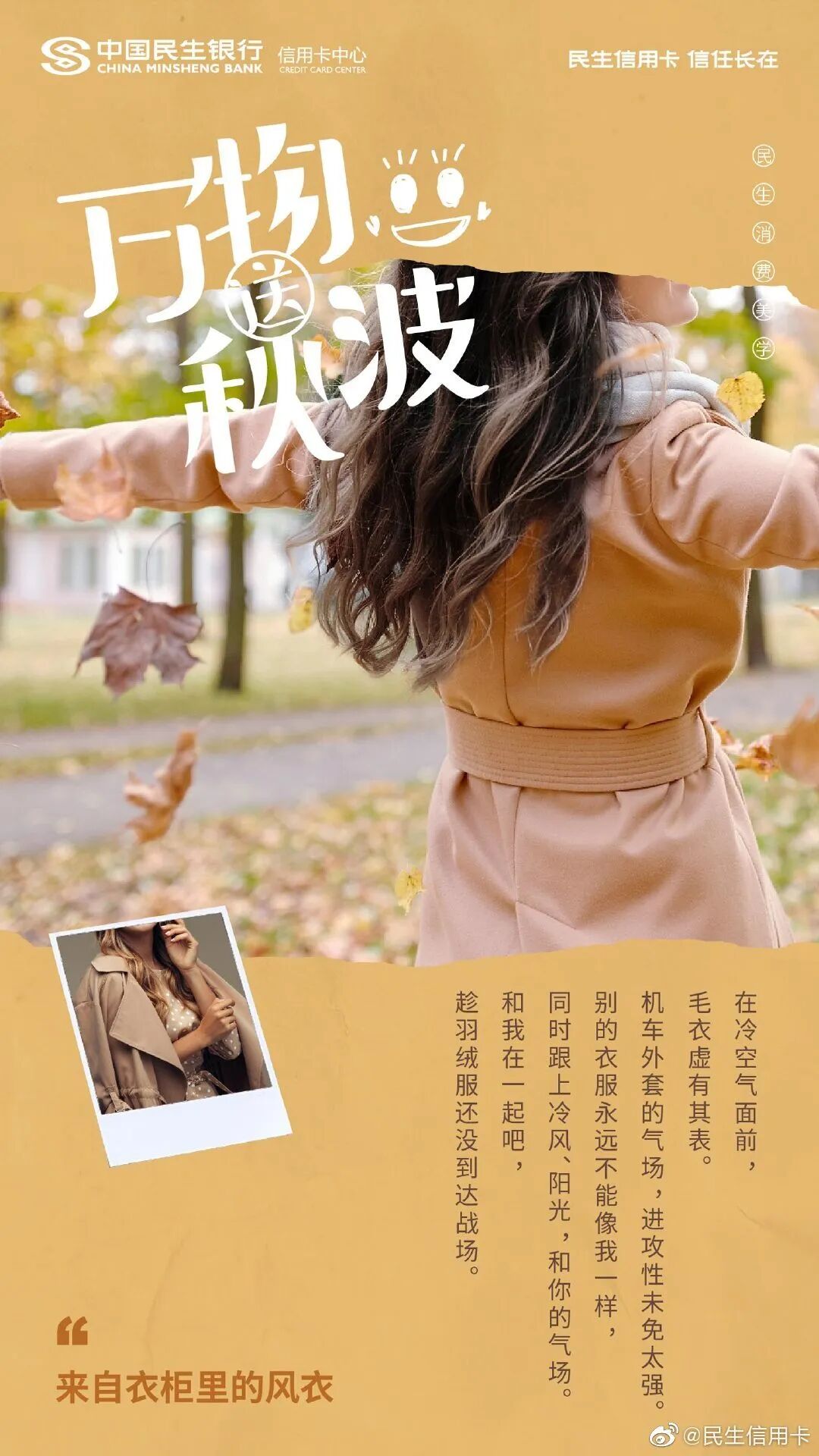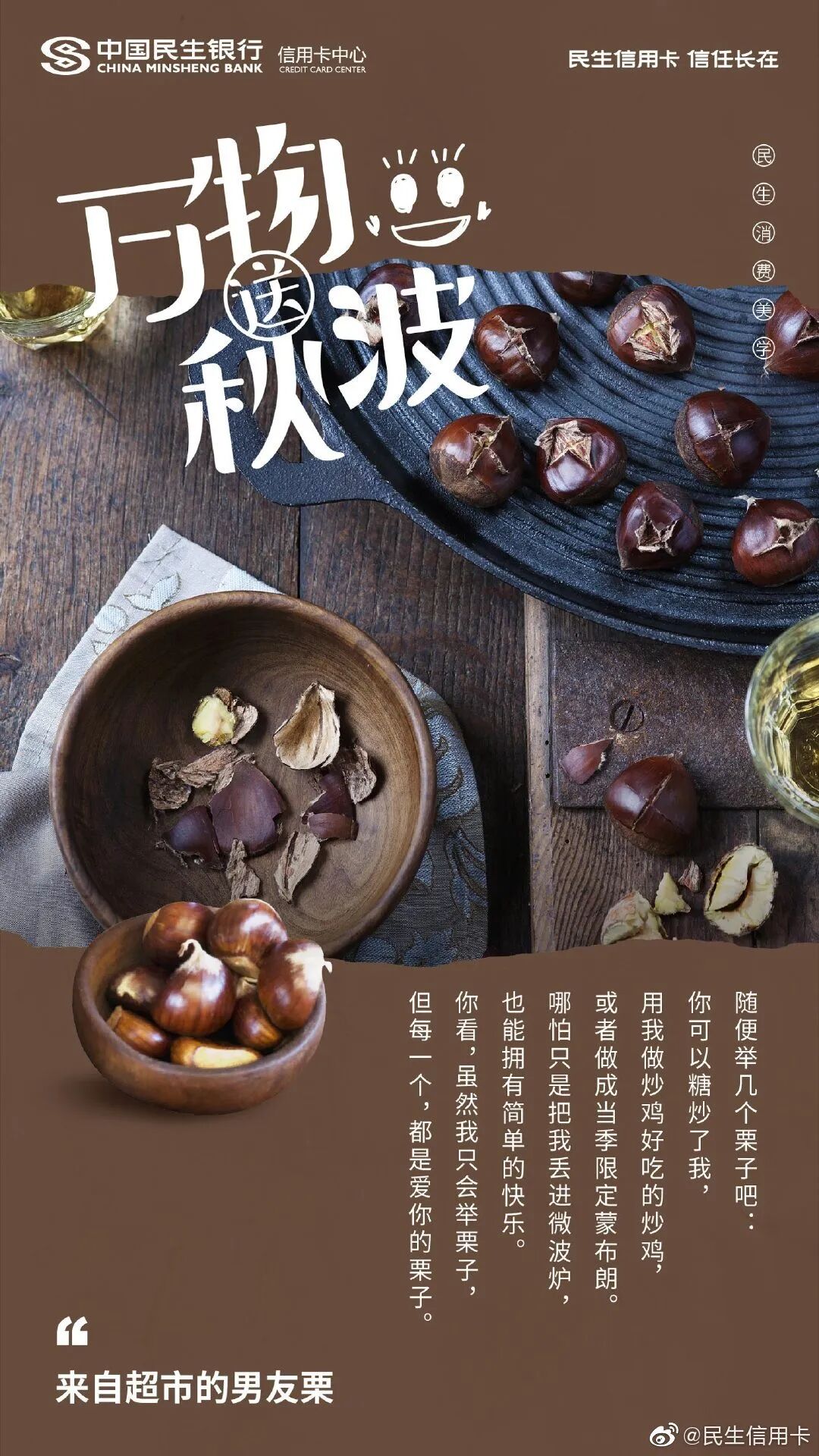 民生信用卡虽不是暖男,却有时候比暖男更贴心。洞察大家秋天穿秋裤、吃板栗进补等习惯,民生信用卡还写了一组送秋波的文案。这些海报以第一人称的对话式文案呈现,把衣柜里的风衣、板栗等塑造成人格化的暖男形象,在秋日中对消费者嘘寒问暖,看完颇有“几缕清风添暖意,一江春水送秋波”的意境,可谓既撩人,又暖心。让人不自觉联想到身边的好物,其实件件都是戏精的贴心管家。