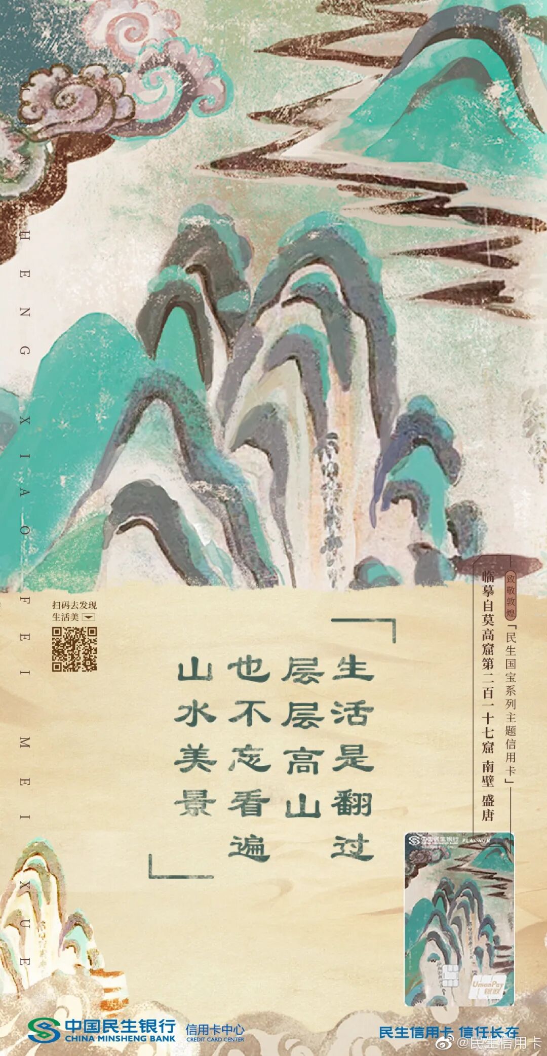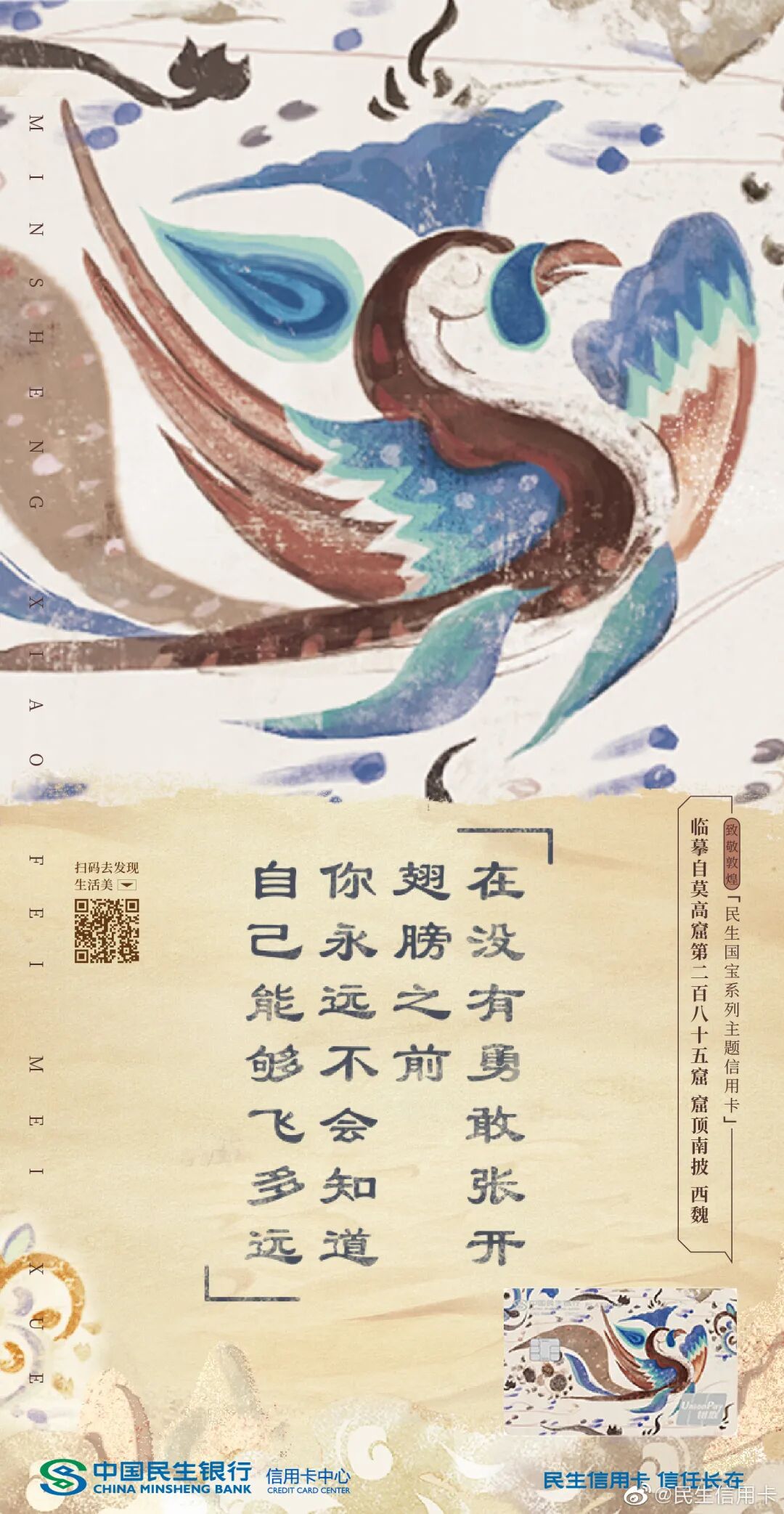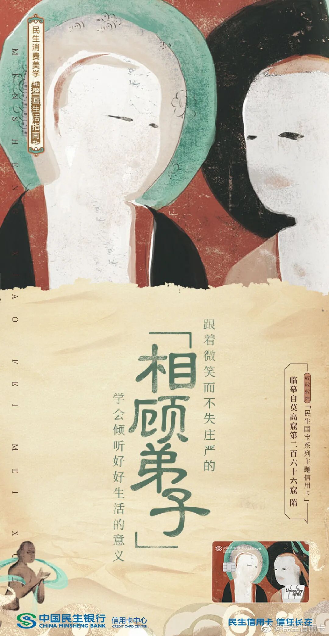 最近民生信用卡又联合敦煌,写出一波富有传统文化韵味的美学文案。看完再次被圈粉,借此机会我们不妨起底民生信用卡的文案姿势。