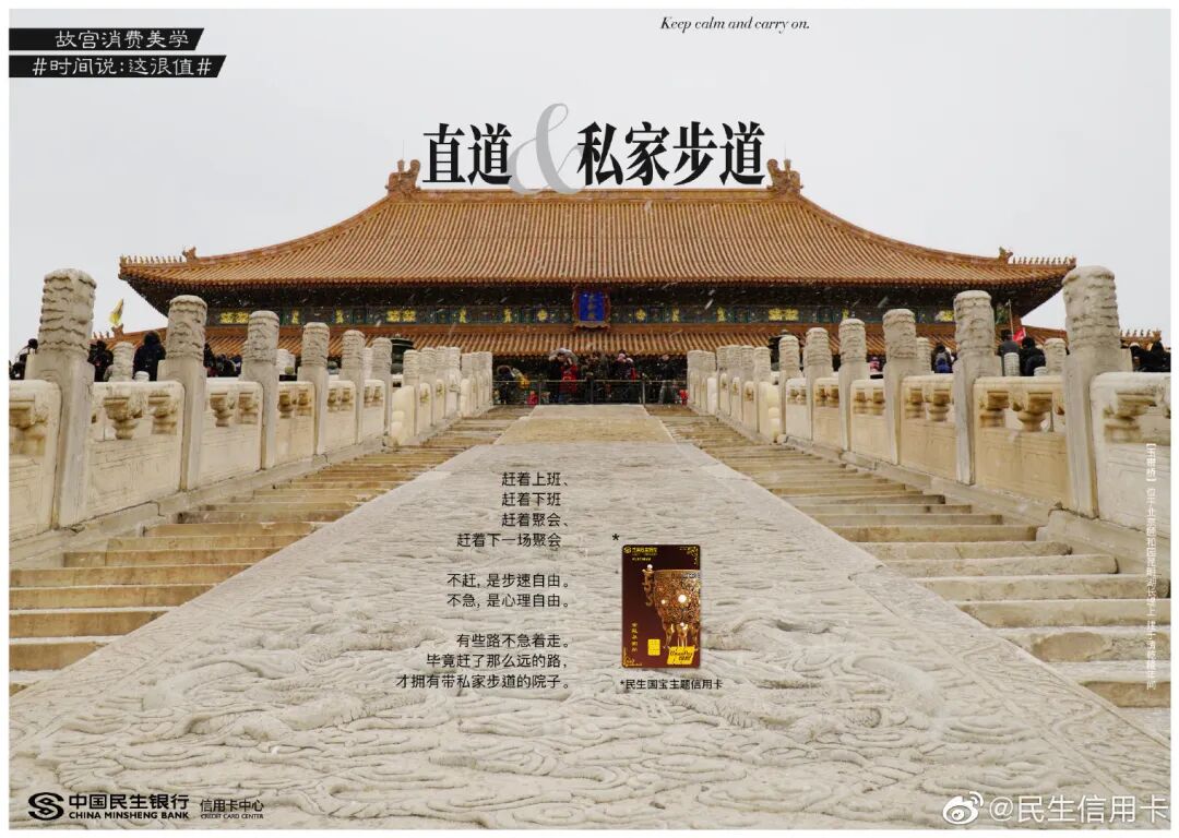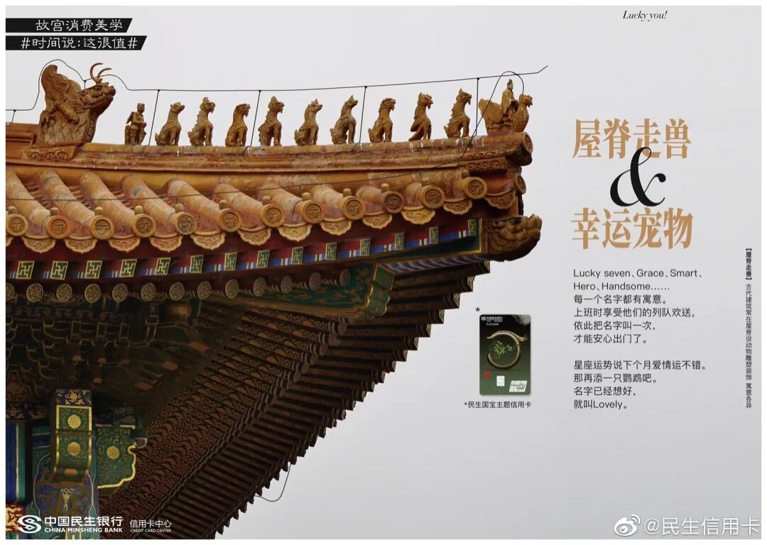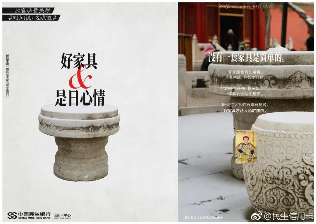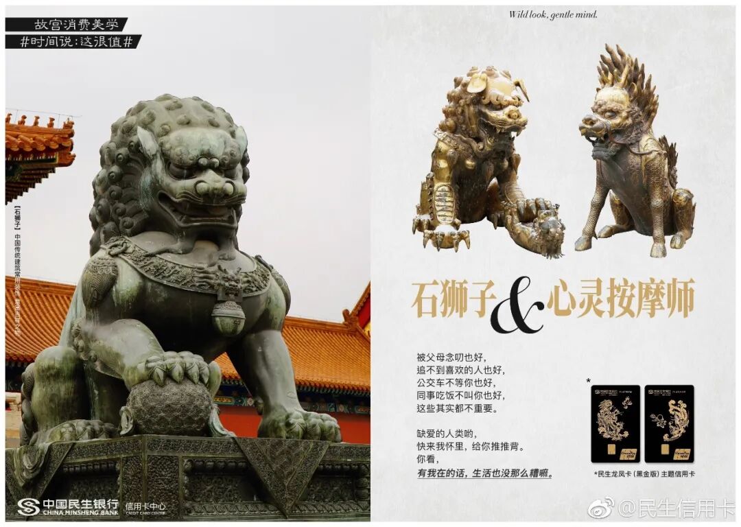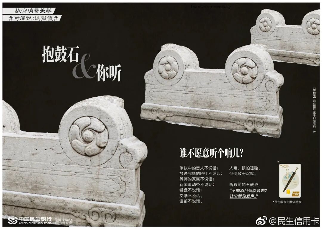 跨界传统IP民生信用卡早已驾轻就熟,两者联合打造了故宫消费美学话题#时间说:这很值#。一件件国宝们如抱鼓石、石狮子等,纷纷放下身段变成戏精本精,故事化演绎故宫文化,分享故宫有料的故事。这些文案让故宫的国宝活起来了,变成有趣的灵魂,拉近了故宫和消费者之间的生活距离。