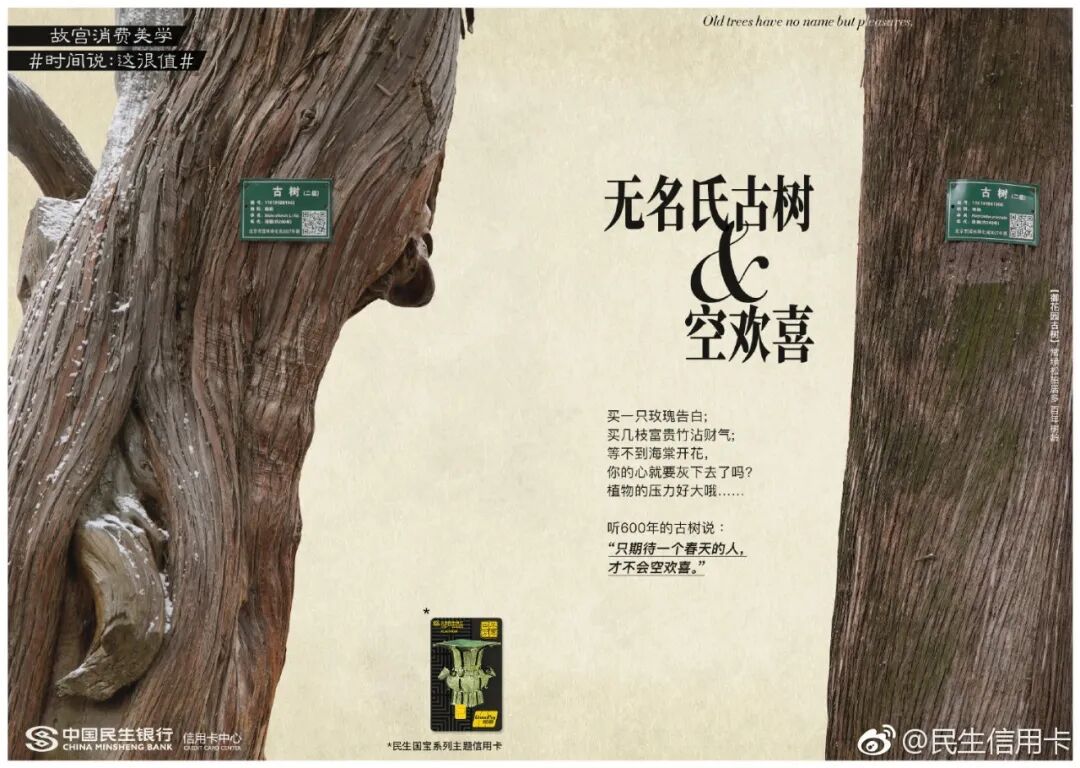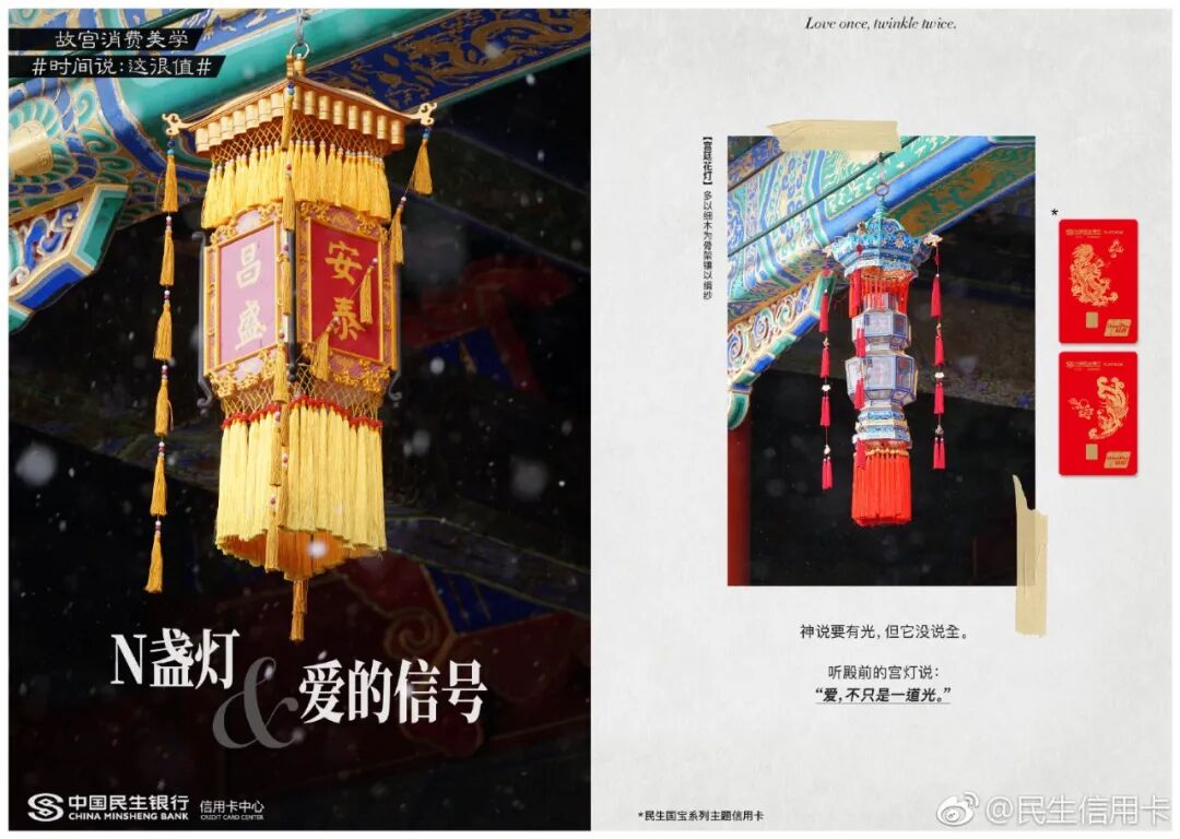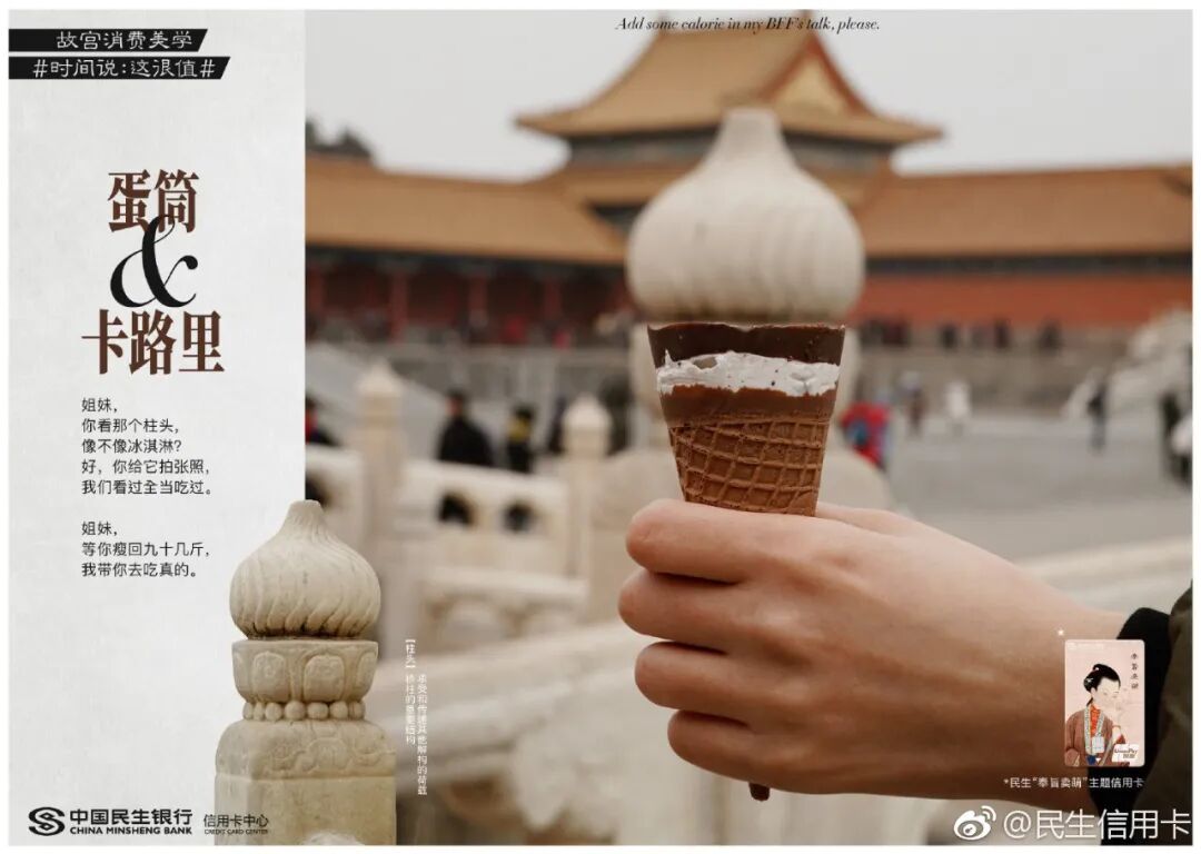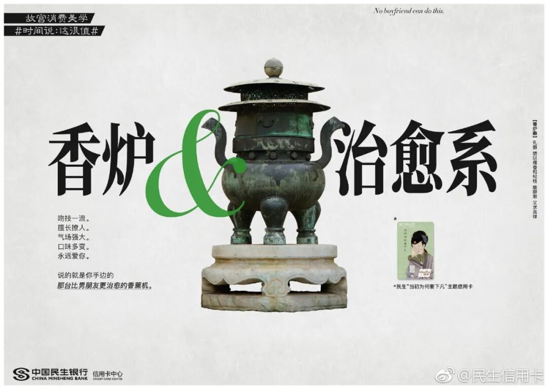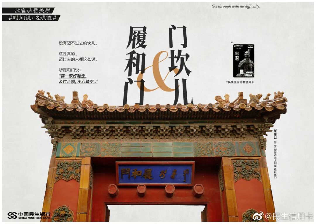 跨界传统IP民生信用卡早已驾轻就熟,两者联合打造了故宫消费美学话题#时间说:这很值#。一件件国宝们如抱鼓石、石狮子等,纷纷放下身段变成戏精本精,故事化演绎故宫文化,分享故宫有料的故事。这些文案让故宫的国宝活起来了,变成有趣的灵魂,拉近了故宫和消费者之间的生活距离。
