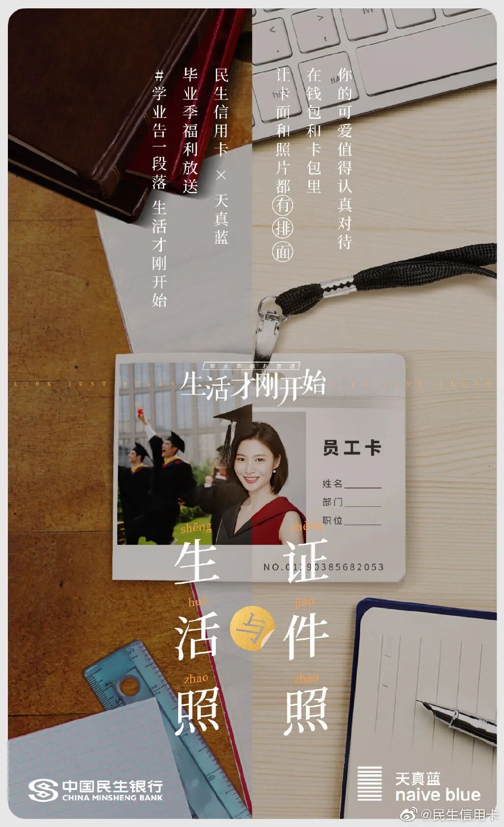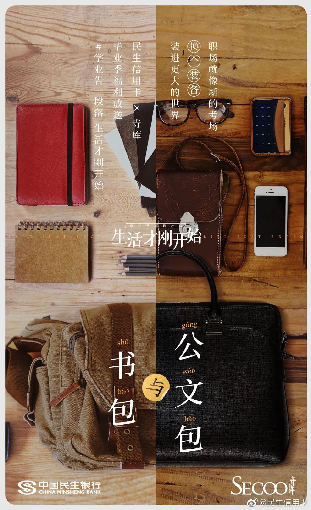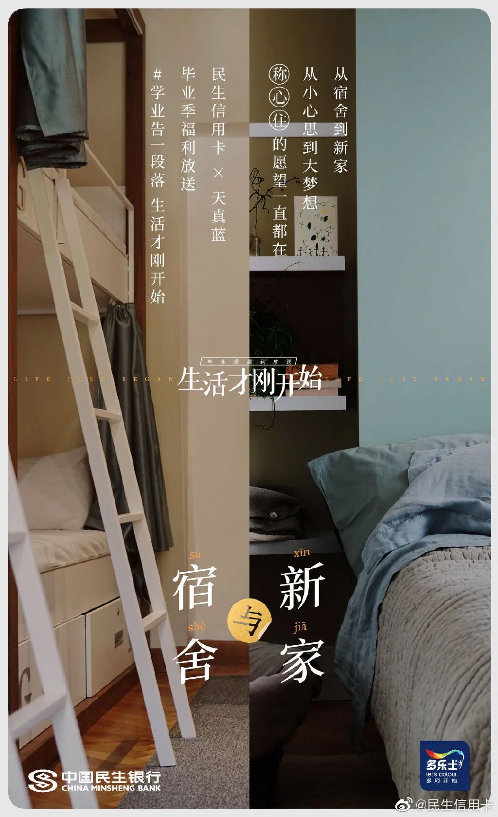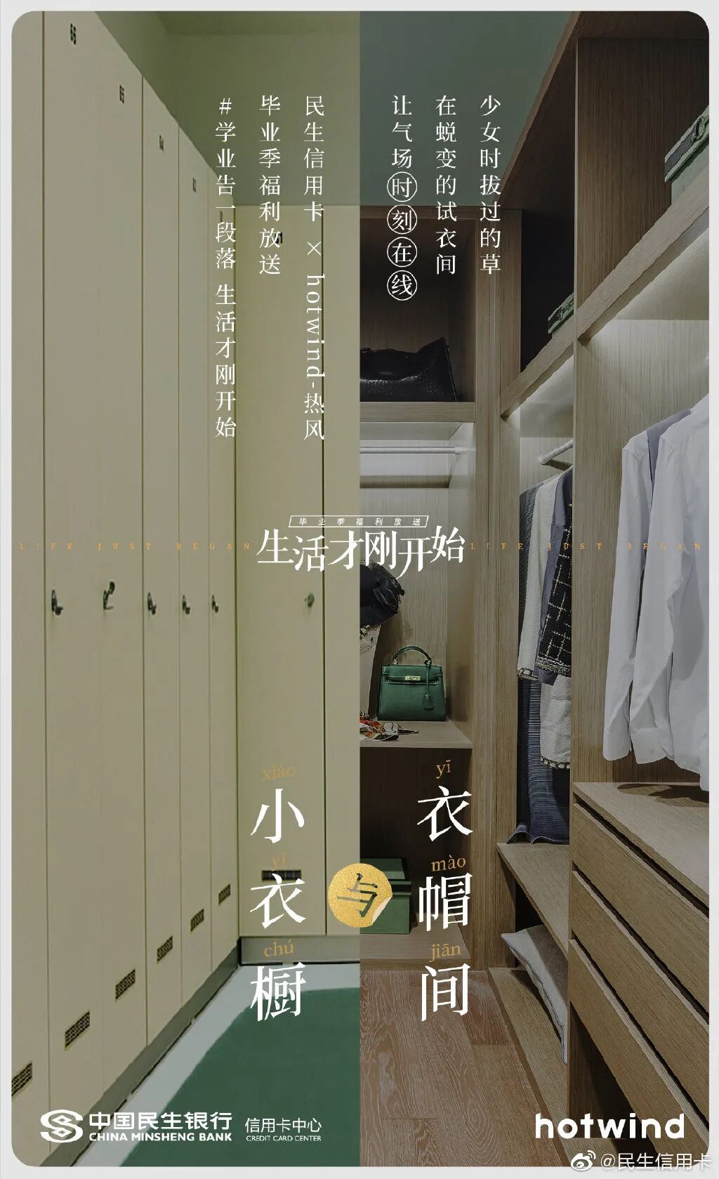 此前为了给毕业生送礼,民生信用卡还发起“带着更好的回来”、“生活才刚开始”主题,联合热风、领英等品牌推出毕业祝福海报。毕业前后有啥区别?书包变成了公文包,小衣橱变成了衣帽间,毕业论文成了工作文件,民生信用卡在强烈的今昔对比中折射毕业的变化,陪伴消费者去到人生的下一站。