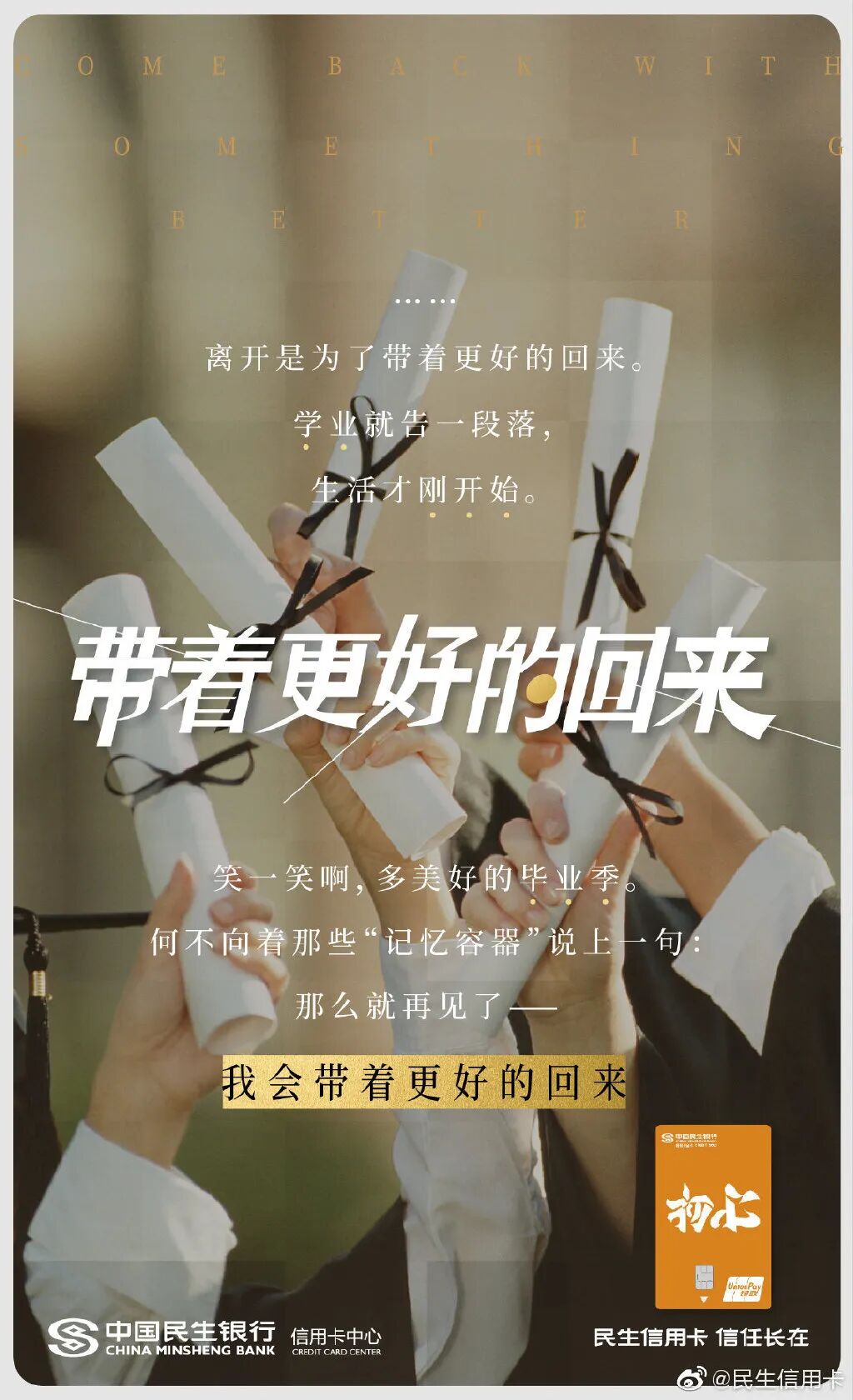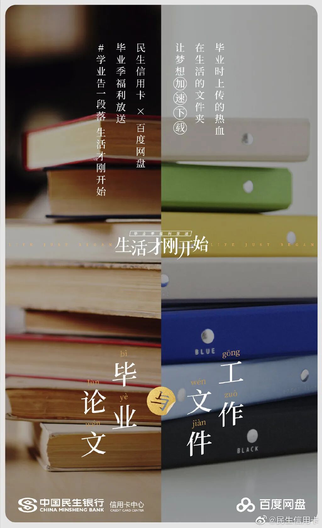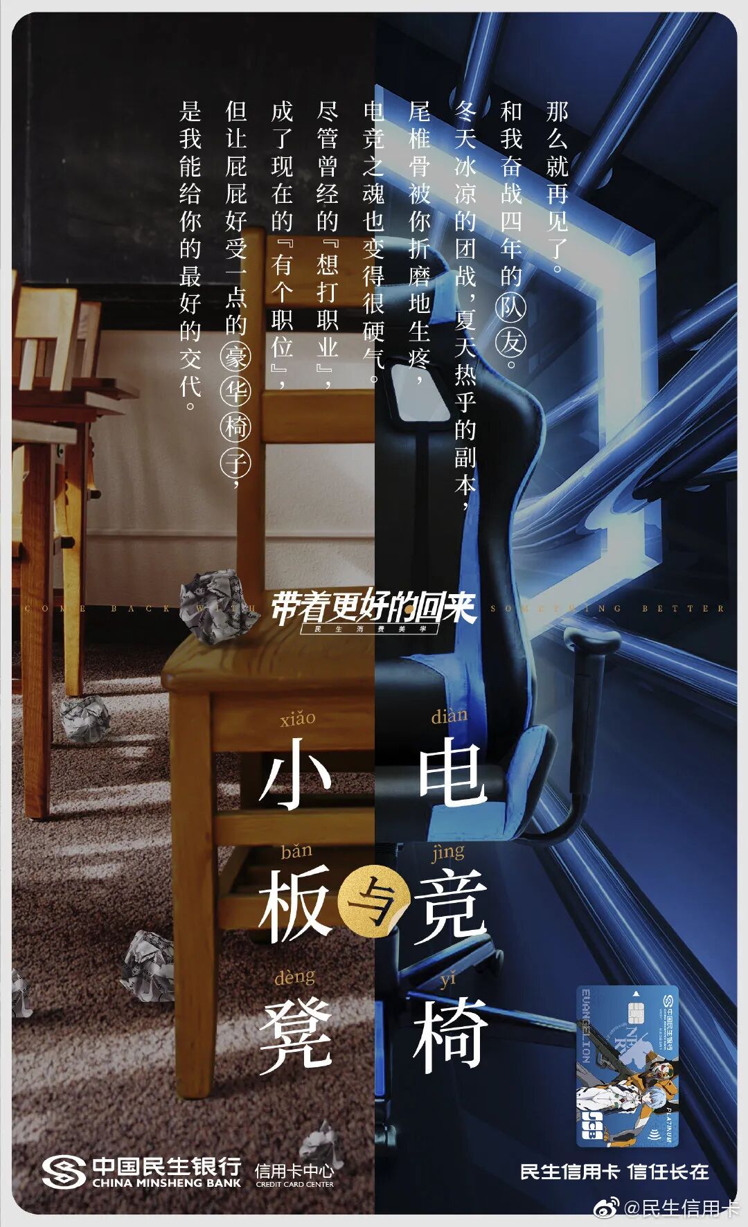 此前为了给毕业生送礼,民生信用卡还发起“带着更好的回来”、“生活才刚开始”主题,联合热风、领英等品牌推出毕业祝福海报。毕业前后有啥区别?书包变成了公文包,小衣橱变成了衣帽间,毕业论文成了工作文件,民生信用卡在强烈的今昔对比中折射毕业的变化,陪伴消费者去到人生的下一站。