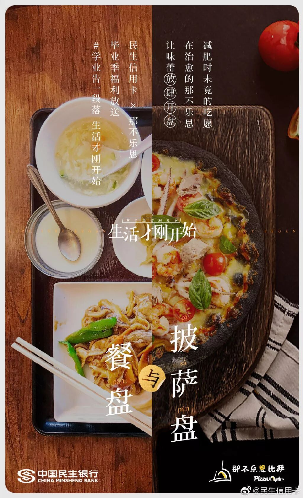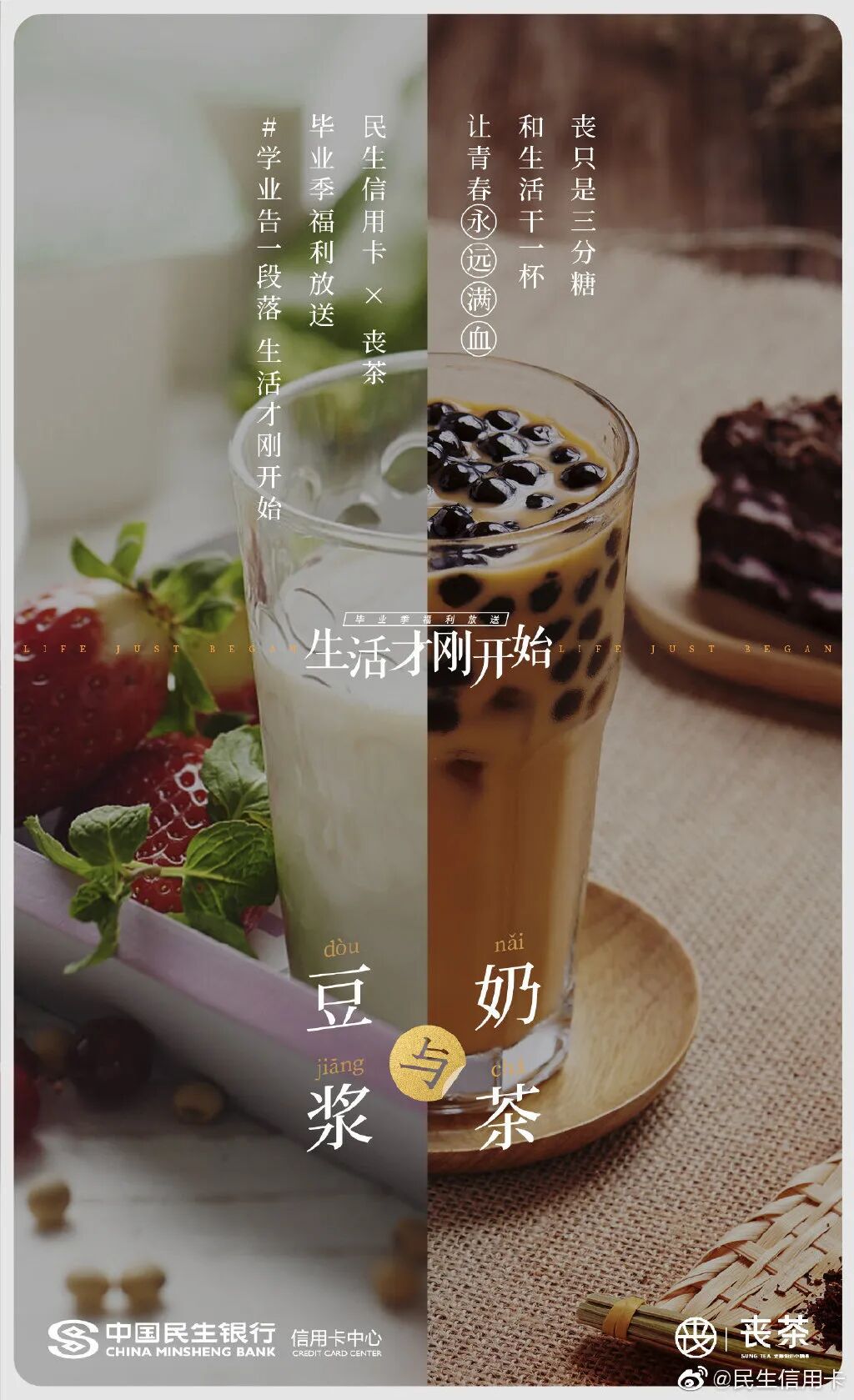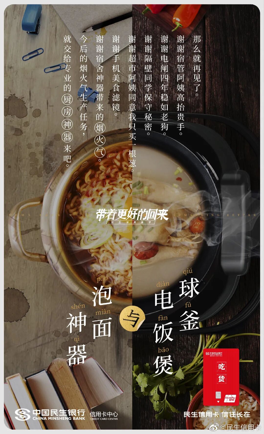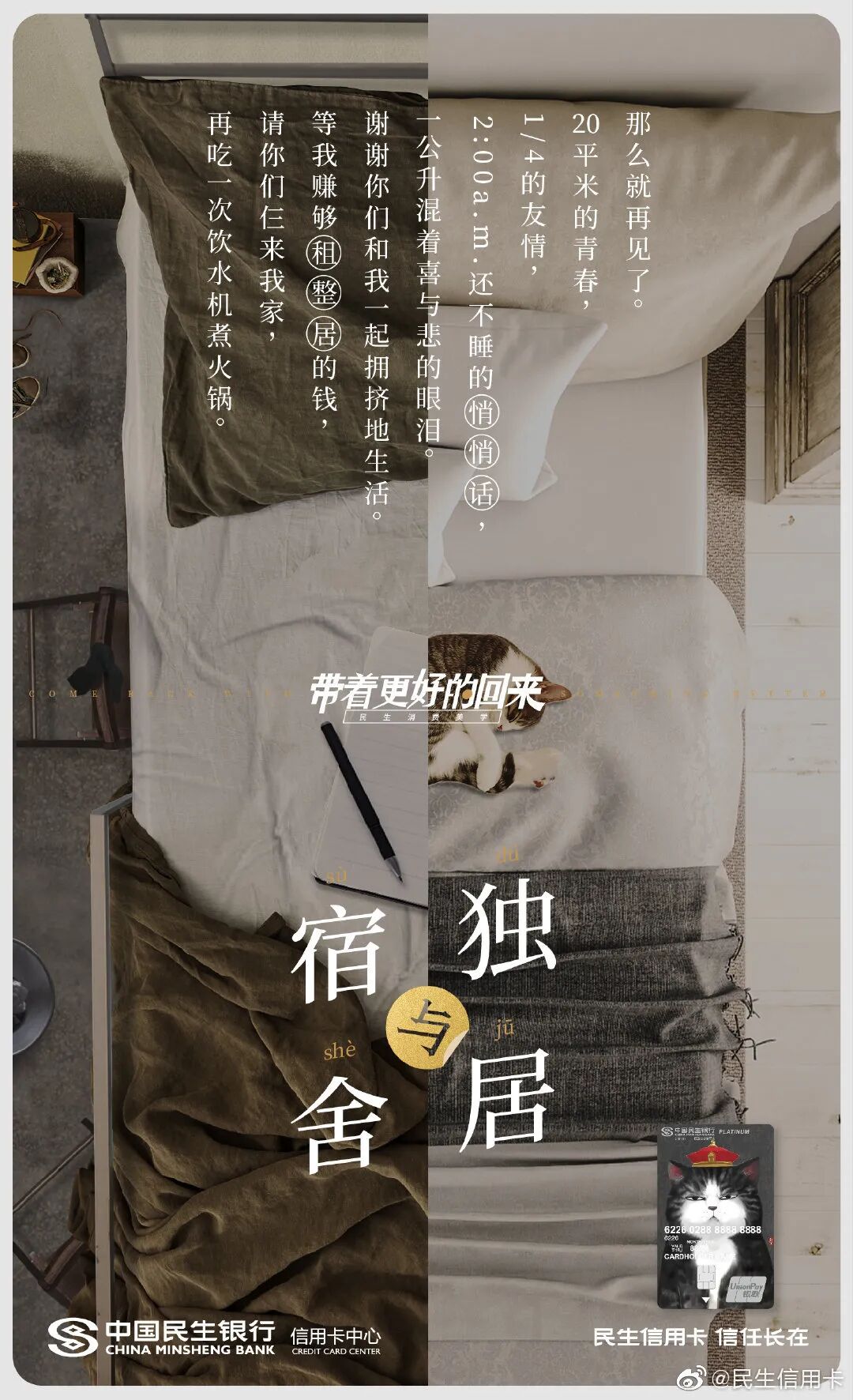 此前为了给毕业生送礼,民生信用卡还发起“带着更好的回来”、“生活才刚开始”主题,联合热风、领英等品牌推出毕业祝福海报。毕业前后有啥区别?书包变成了公文包,小衣橱变成了衣帽间,毕业论文成了工作文件,民生信用卡在强烈的今昔对比中折射毕业的变化,陪伴消费者去到人生的下一站。