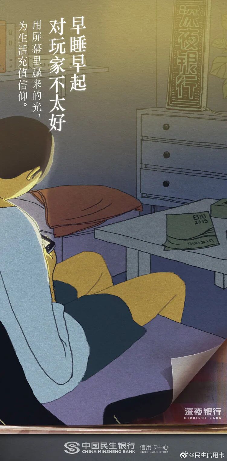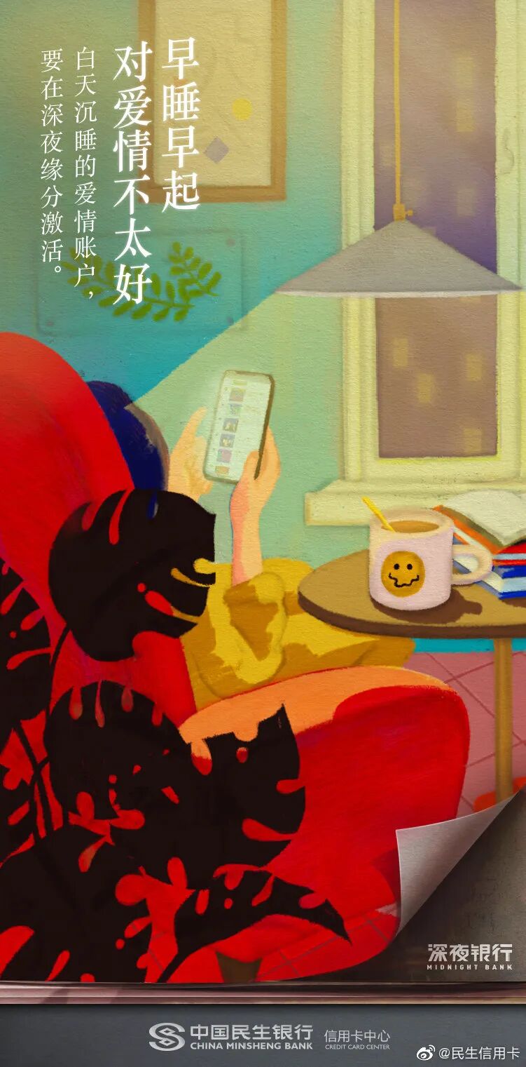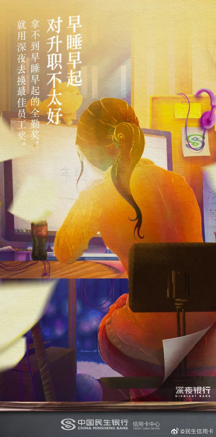熬夜是年轻人的关键词,民生信用卡深谙大家晚睡晚起的习惯,以“早睡早起,对XXX不太好”为深夜对话句式,用否定的形式激发起这届年轻人的消费欲望,展现了更懂年轻人的品牌关怀。