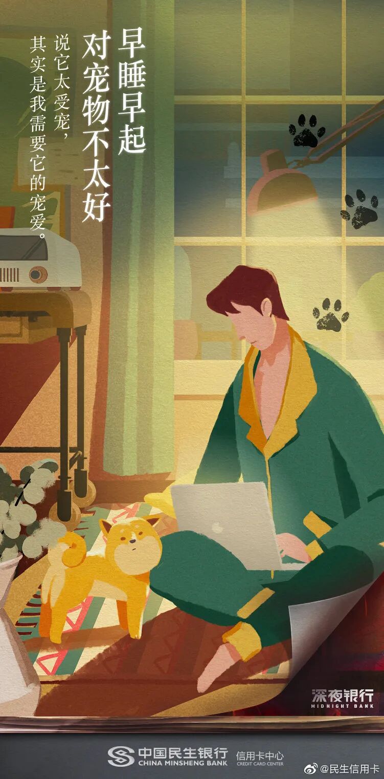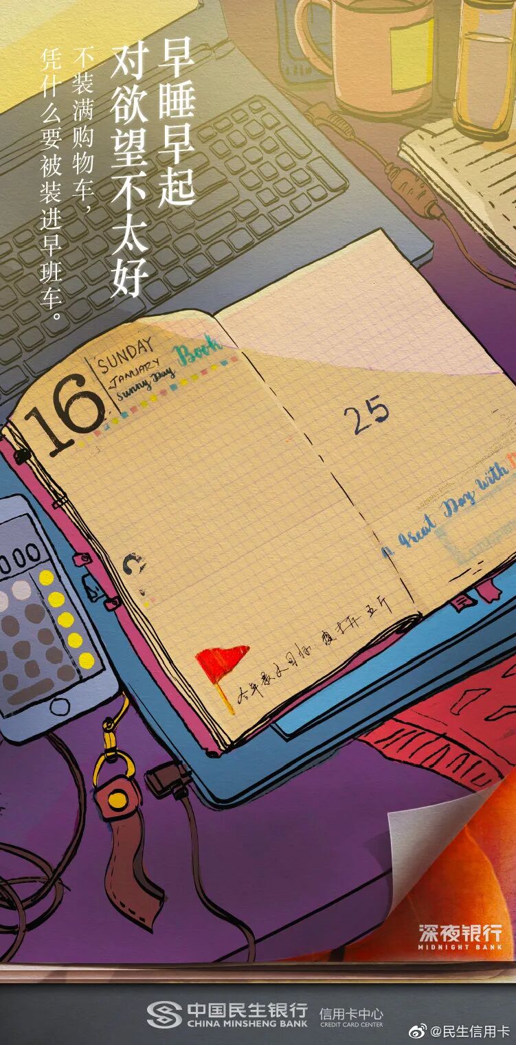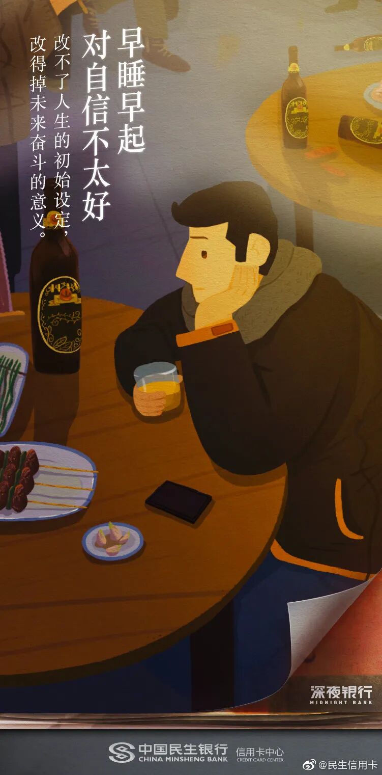 熬夜是年轻人的关键词,民生信用卡深谙大家晚睡晚起的习惯,以“早睡早起,对XXX不太好”为深夜对话句式,用否定的形式激发起这届年轻人的消费欲望,展现了更懂年轻人的品牌关怀。