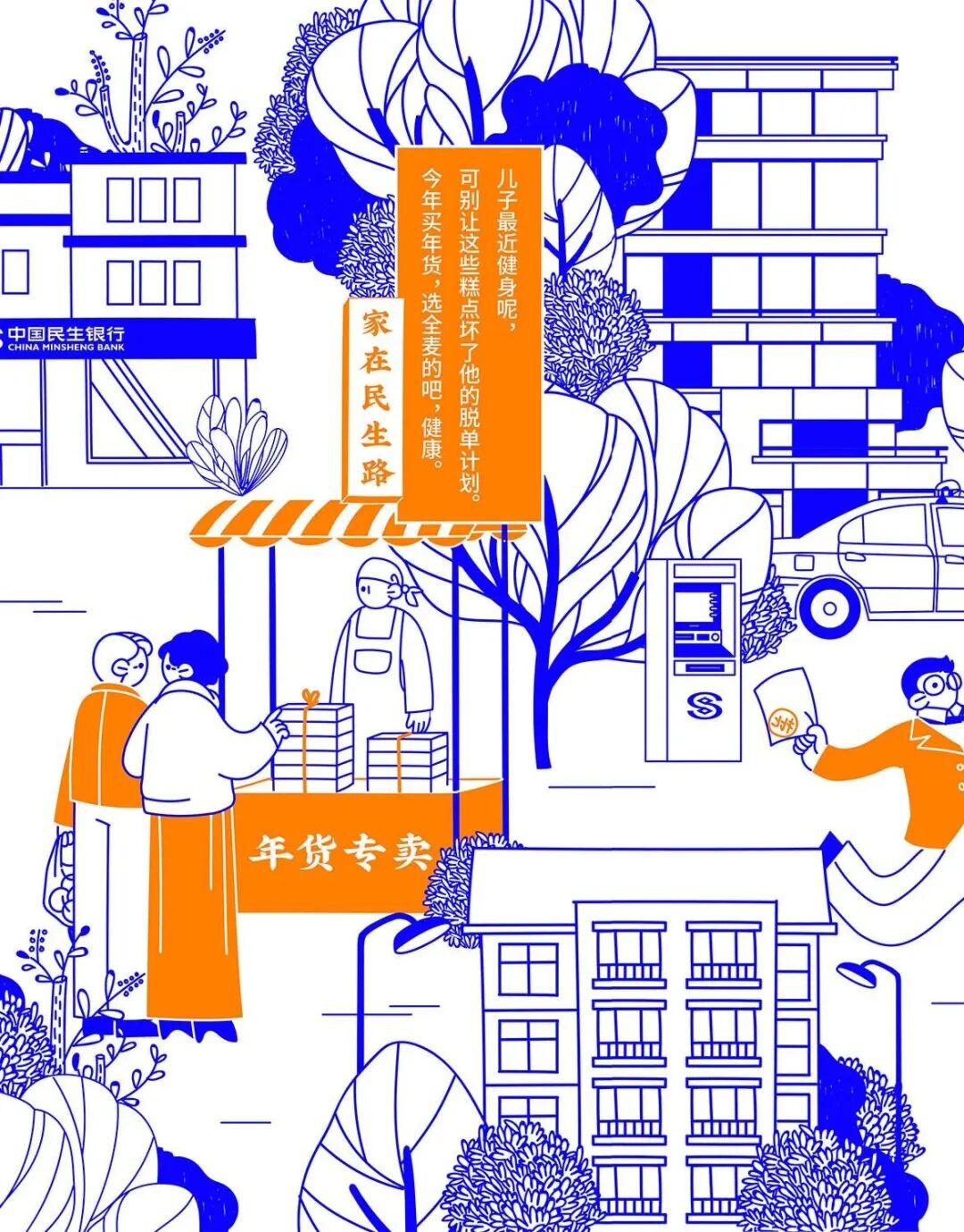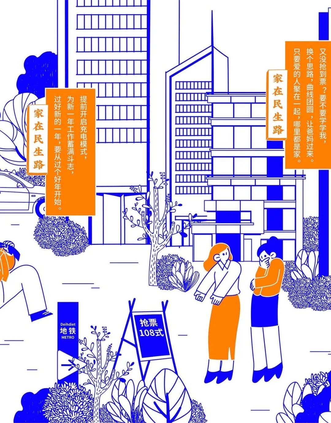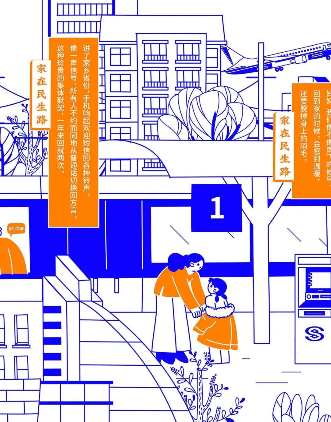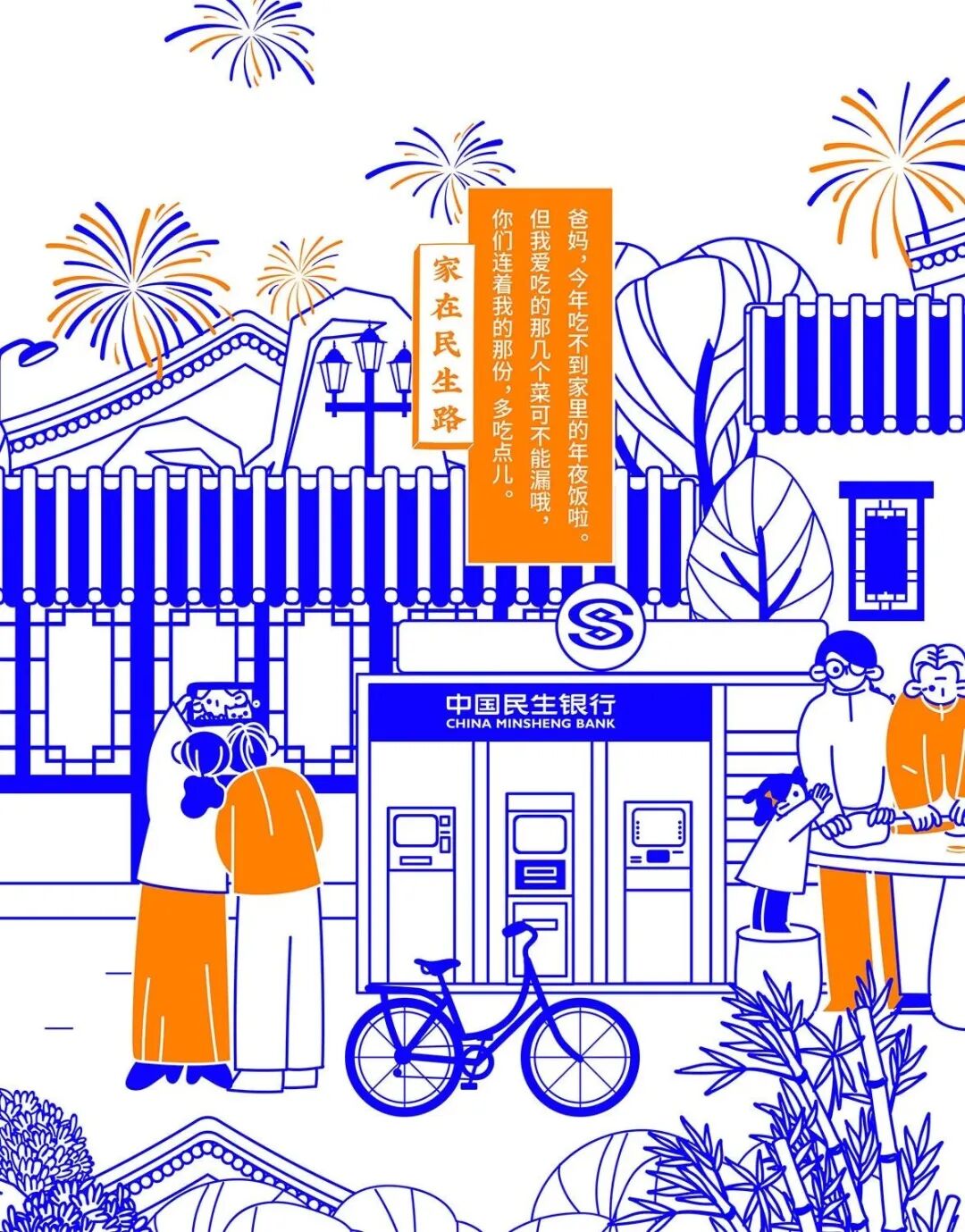 今年春节,民生信用卡捕捉大家春节回家的团圆场景,结合品牌名“民生”的美好寓意,绘制一幅有梗、有春意《家在民生路》图鉴。