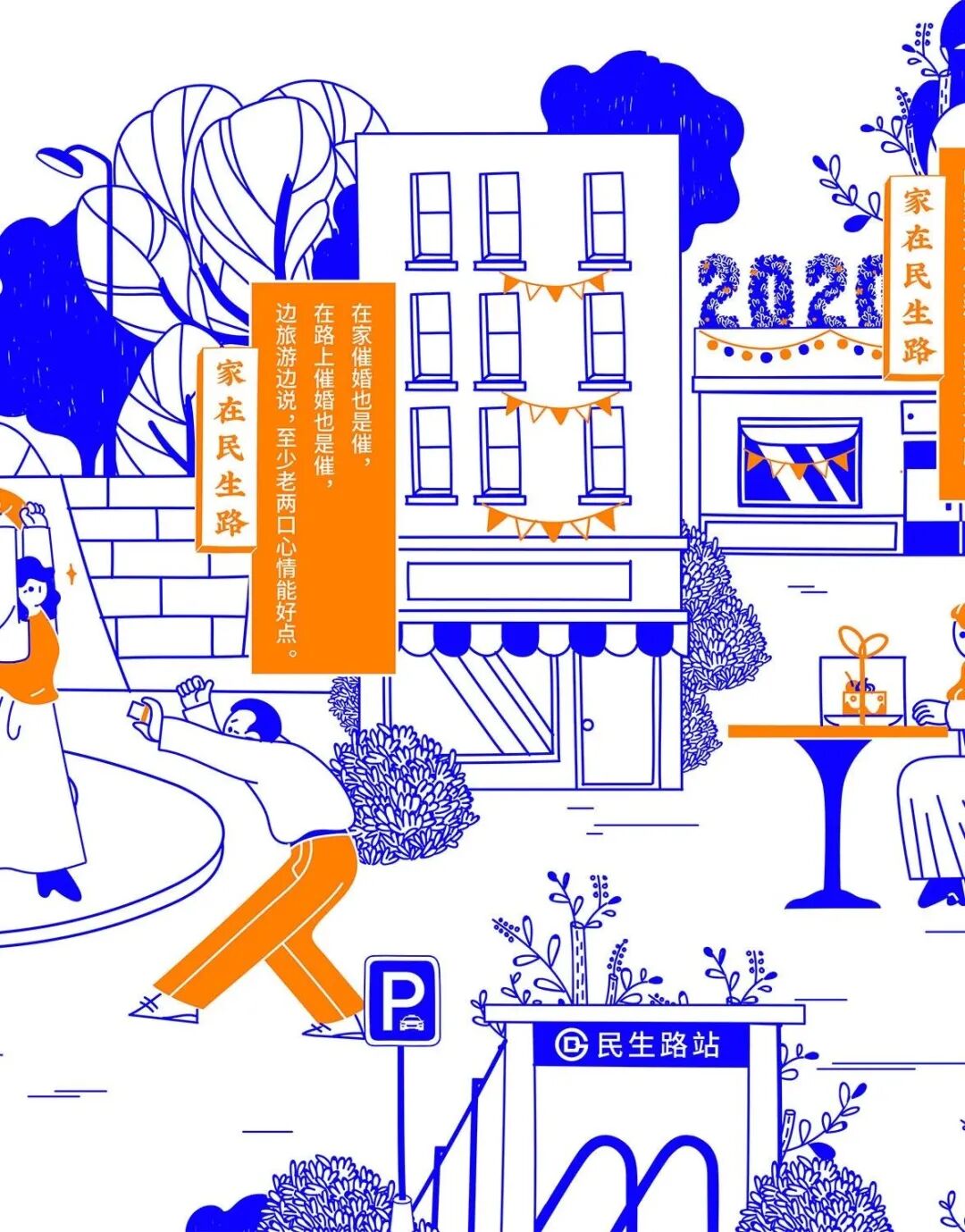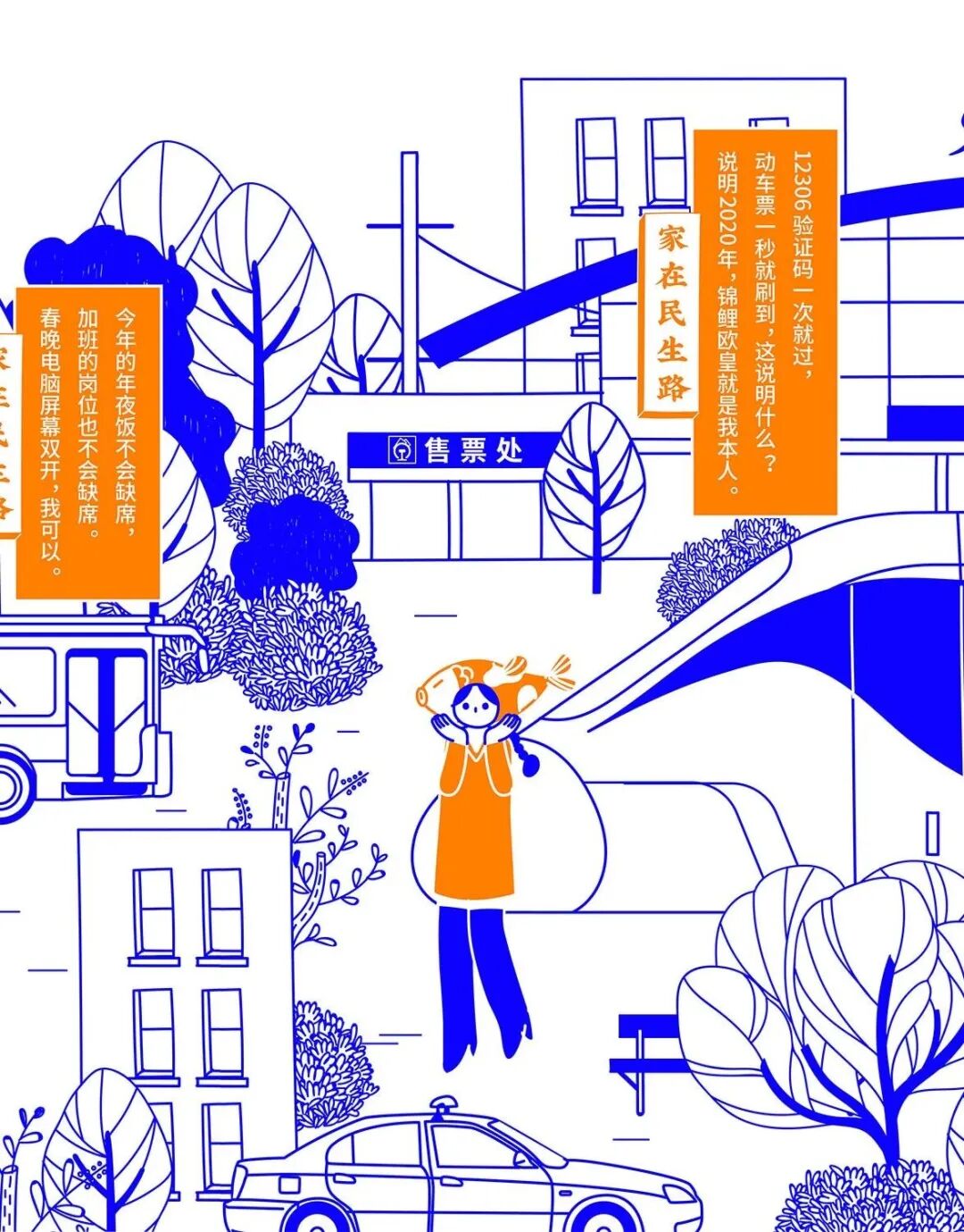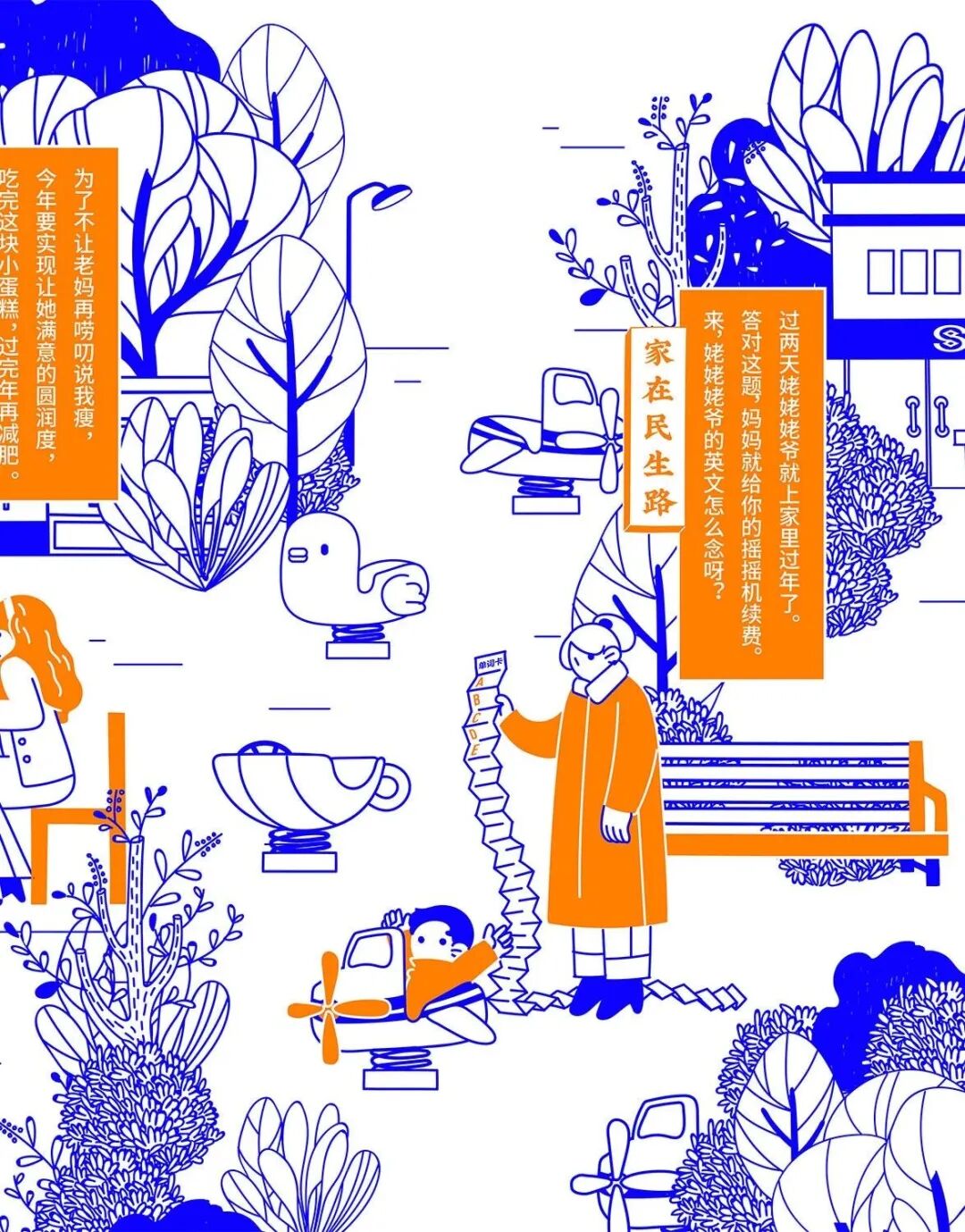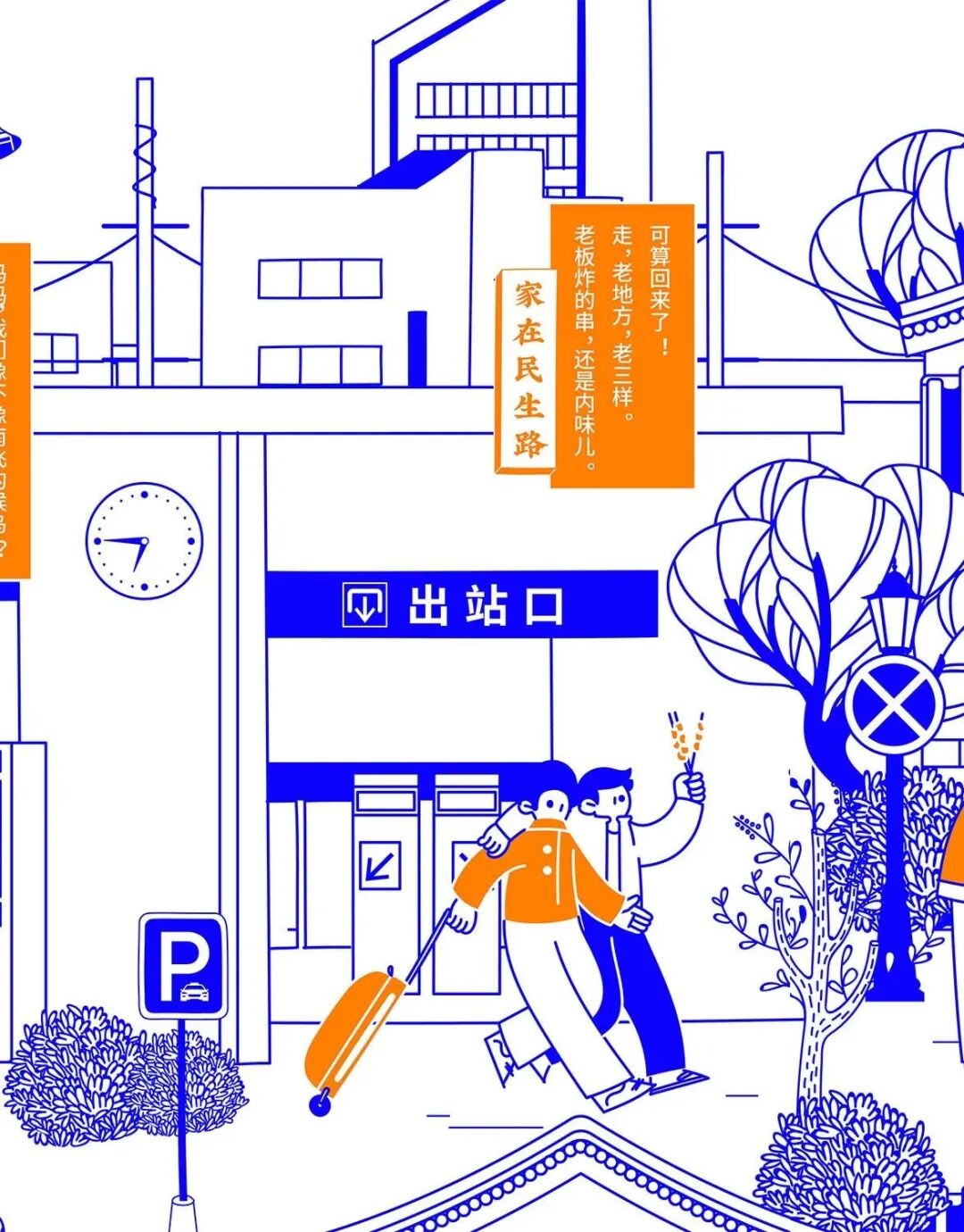 今年春节,民生信用卡捕捉大家春节回家的团圆场景,结合品牌名“民生”的美好寓意,绘制一幅有梗、有春意《家在民生路》图鉴。