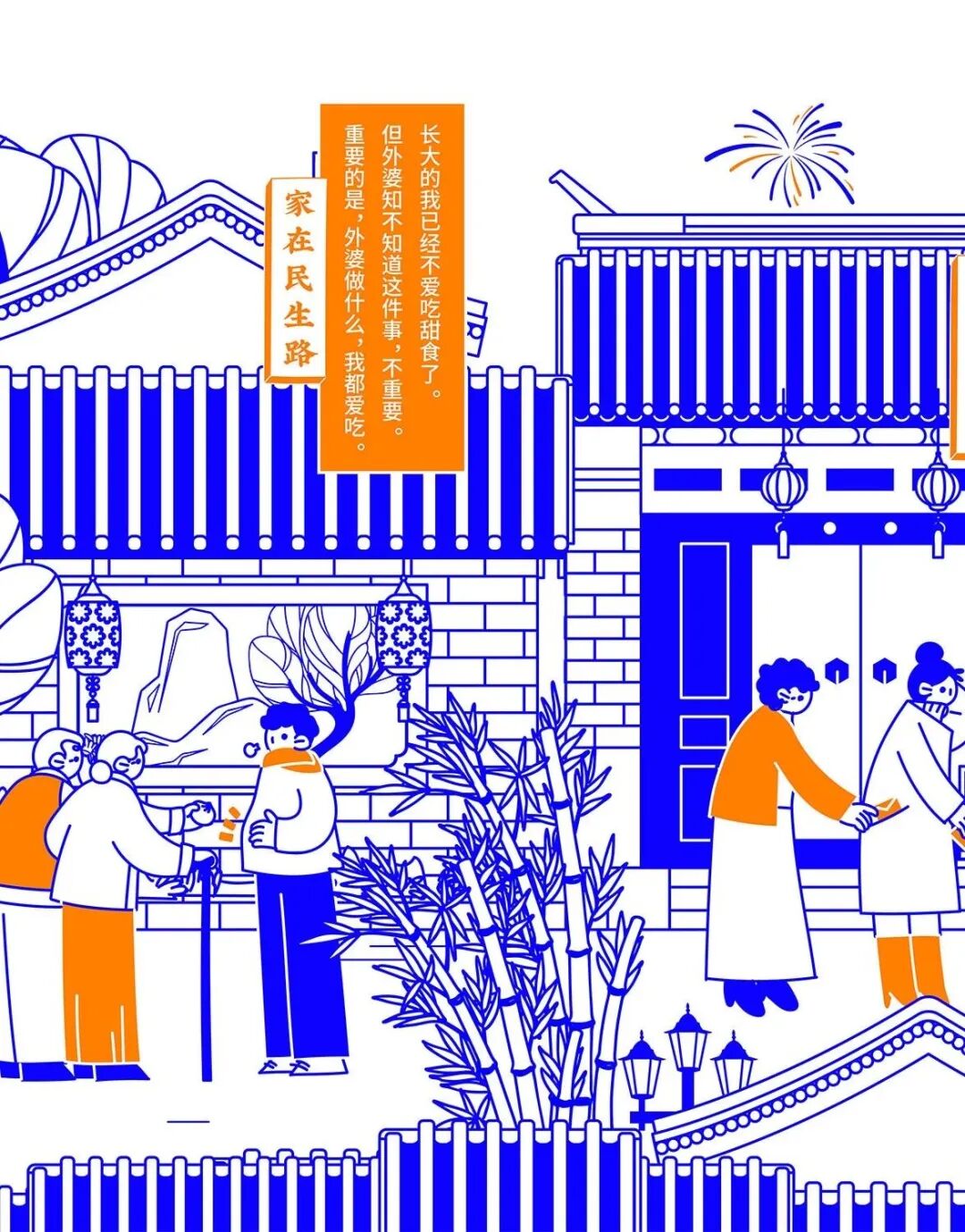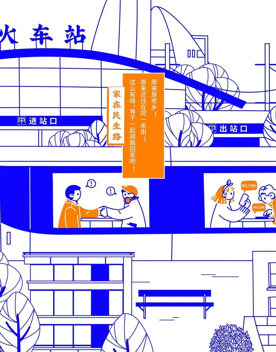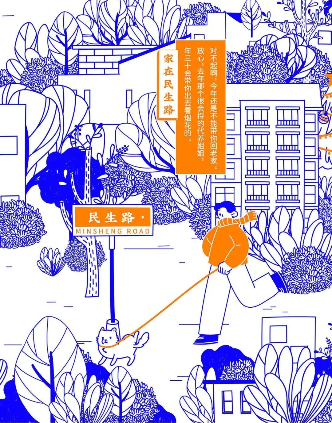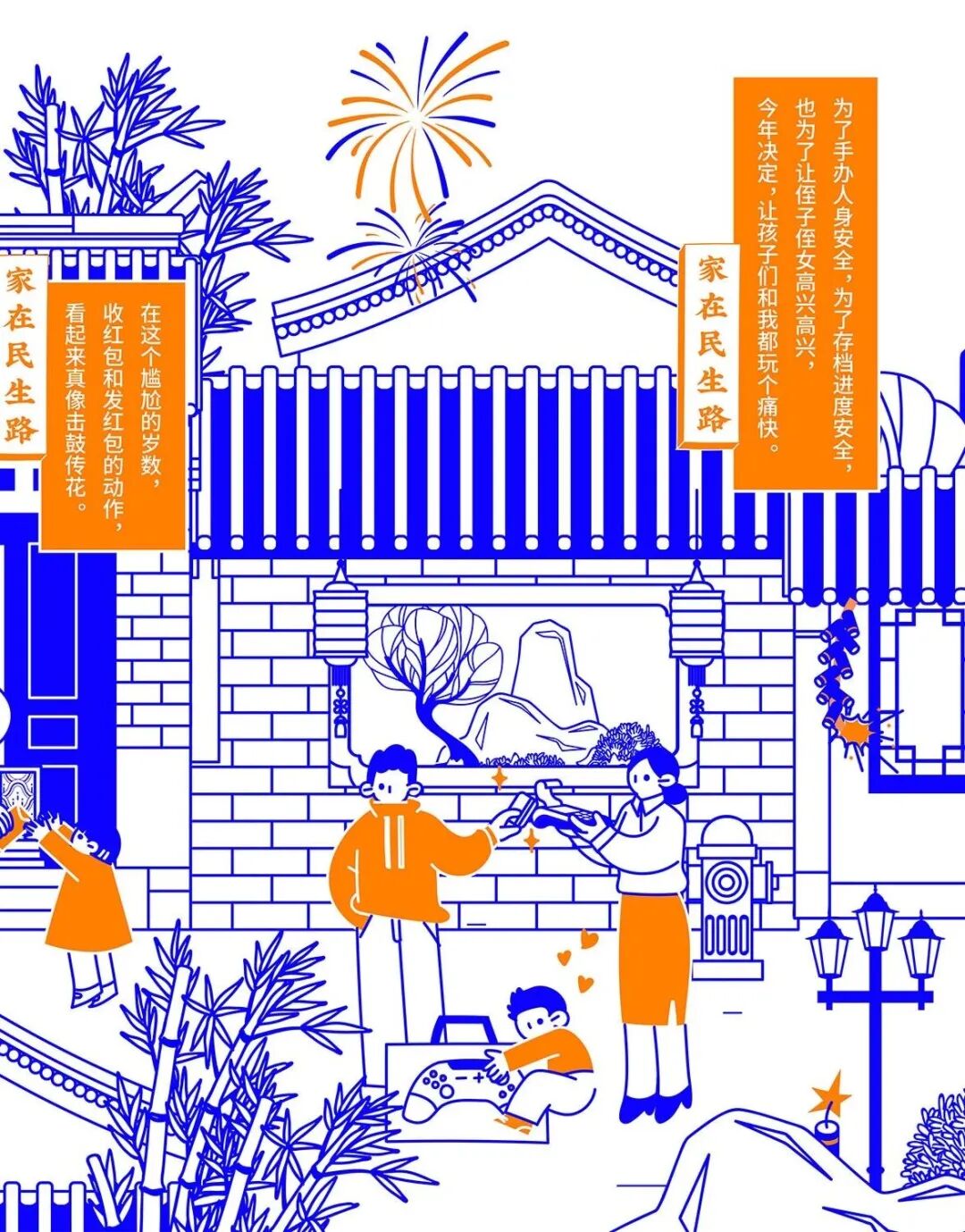 今年春节,民生信用卡捕捉大家春节回家的团圆场景,结合品牌名“民生”的美好寓意,绘制一幅有梗、有春意《家在民生路》图鉴。