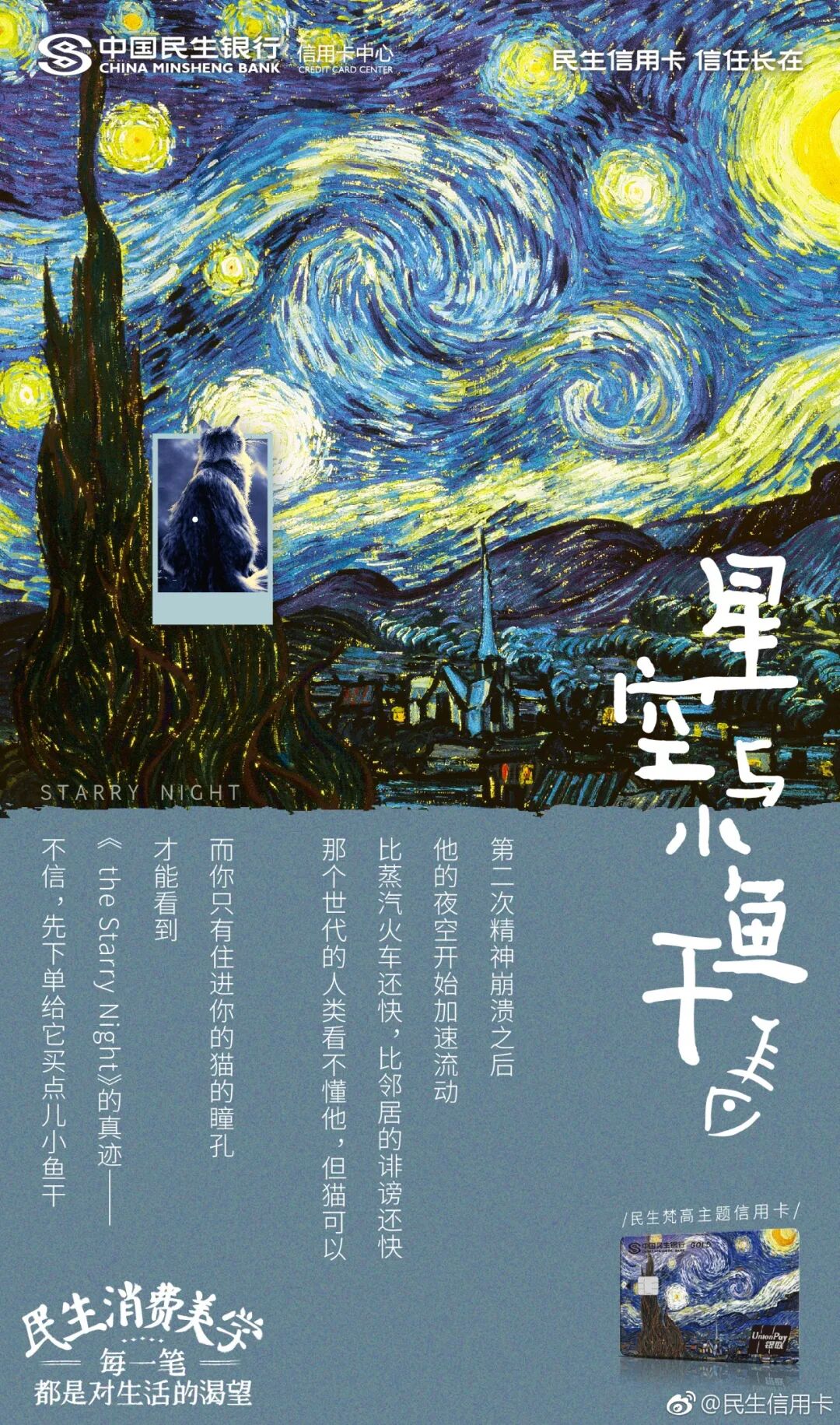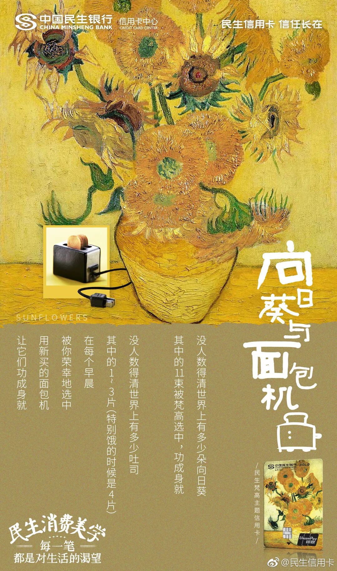 印象最深刻的还是民生信用卡联合梵高IP玩转名画营销,民生信用卡选取梵高的名画《田野》《梵高》等,将名画的元素和生活的食物建立情感连接。酥脆金黄的烤吐司,像极了梵高笔下的向日葵,小鱼干如同赏析名画的望远镜.......无论是文案还是视觉,都透露着艺术感和高格调,民生信用卡依托于既有的梵高名画意境,从侧面鼓励消费者下单买小鱼干、吐司机等,为每一笔消费加入了更多生活的画意。
