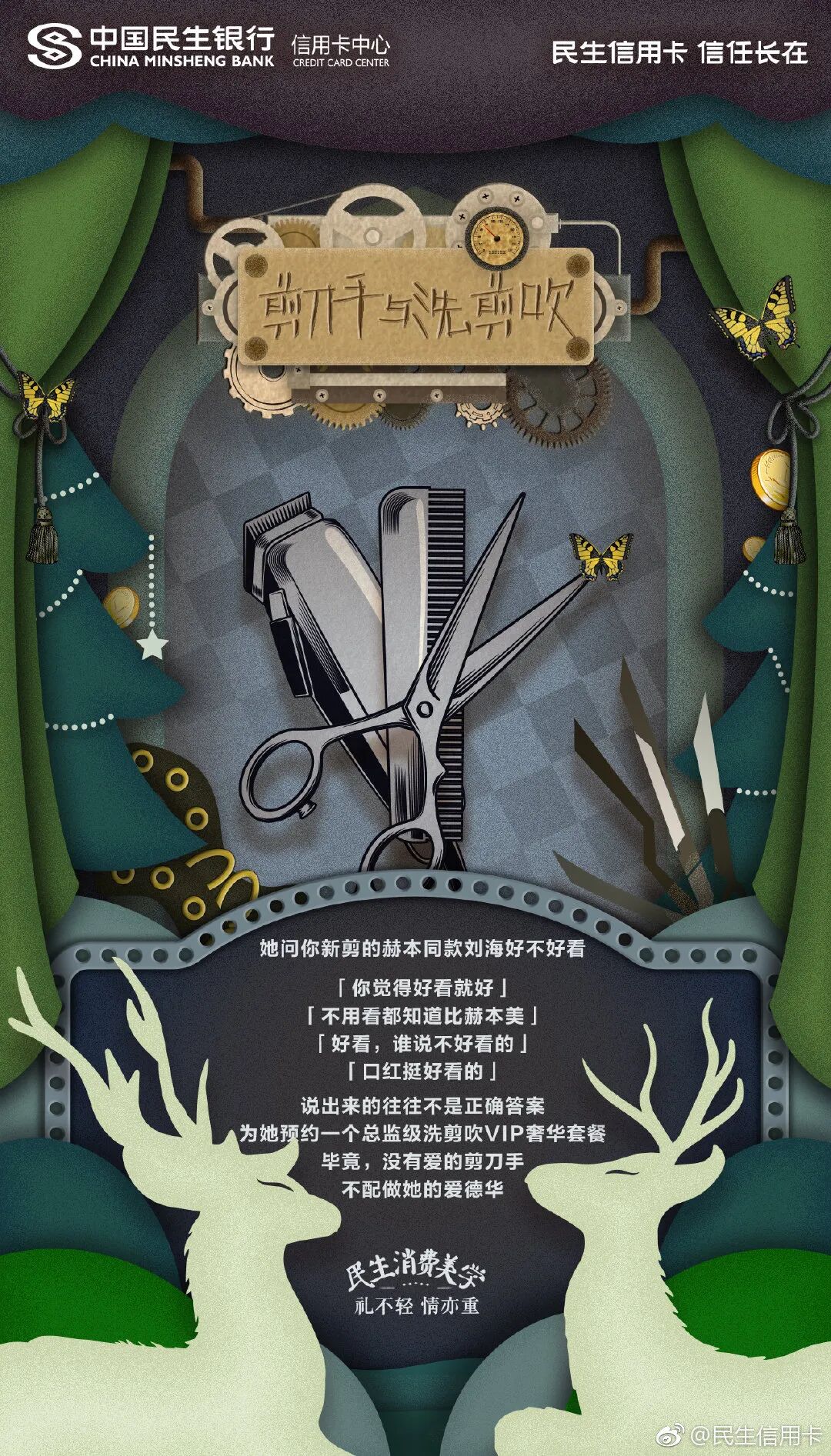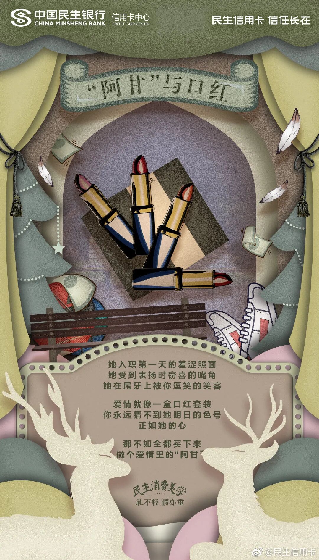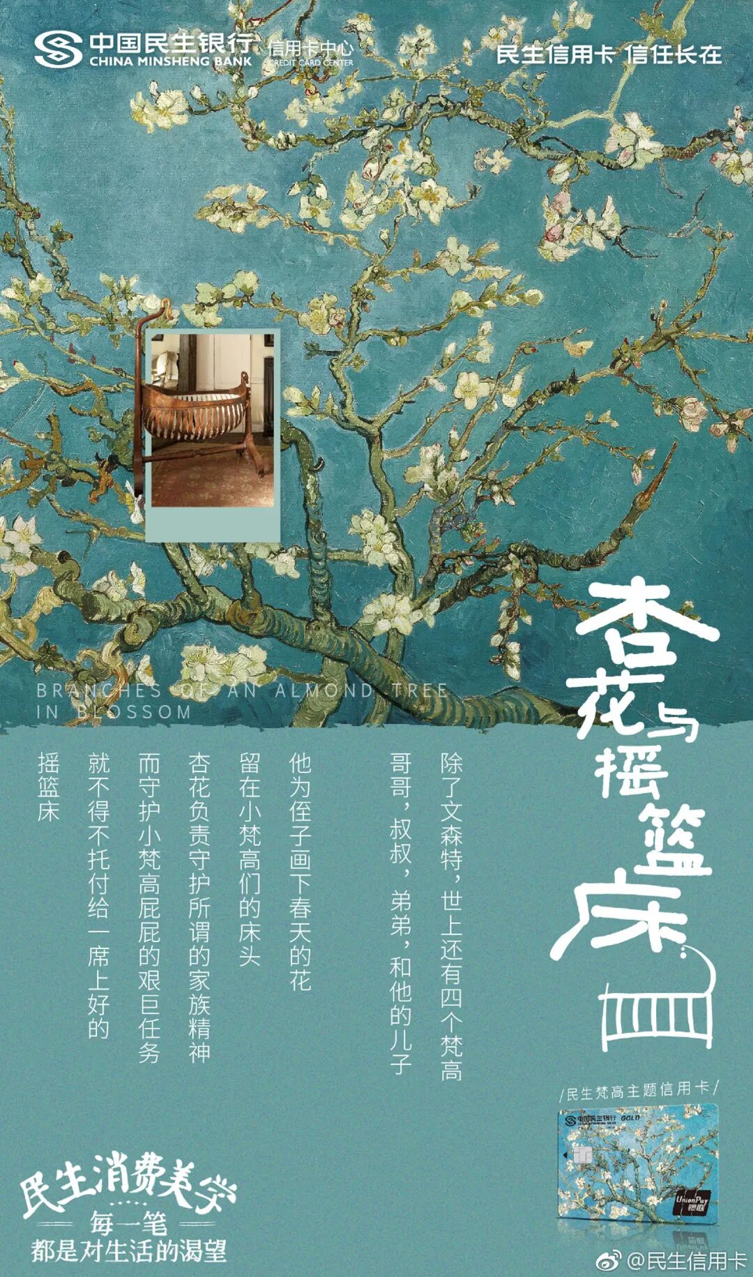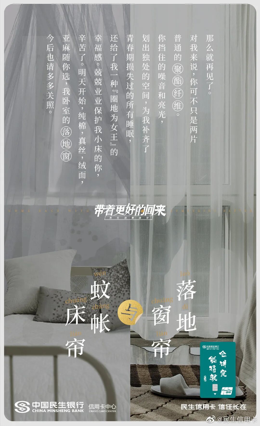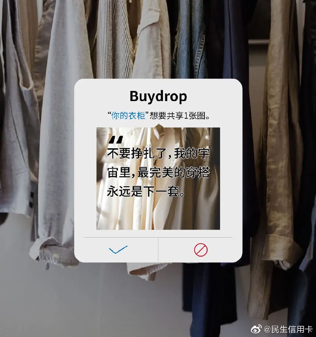 但我发现在银行领域,有个品牌的文案,也可以媲美台湾全联的“经济美学”文案。民生银行信用卡的文案,总能以美学的视角审视花钱这件事,给年轻消费者一个消费的理由。