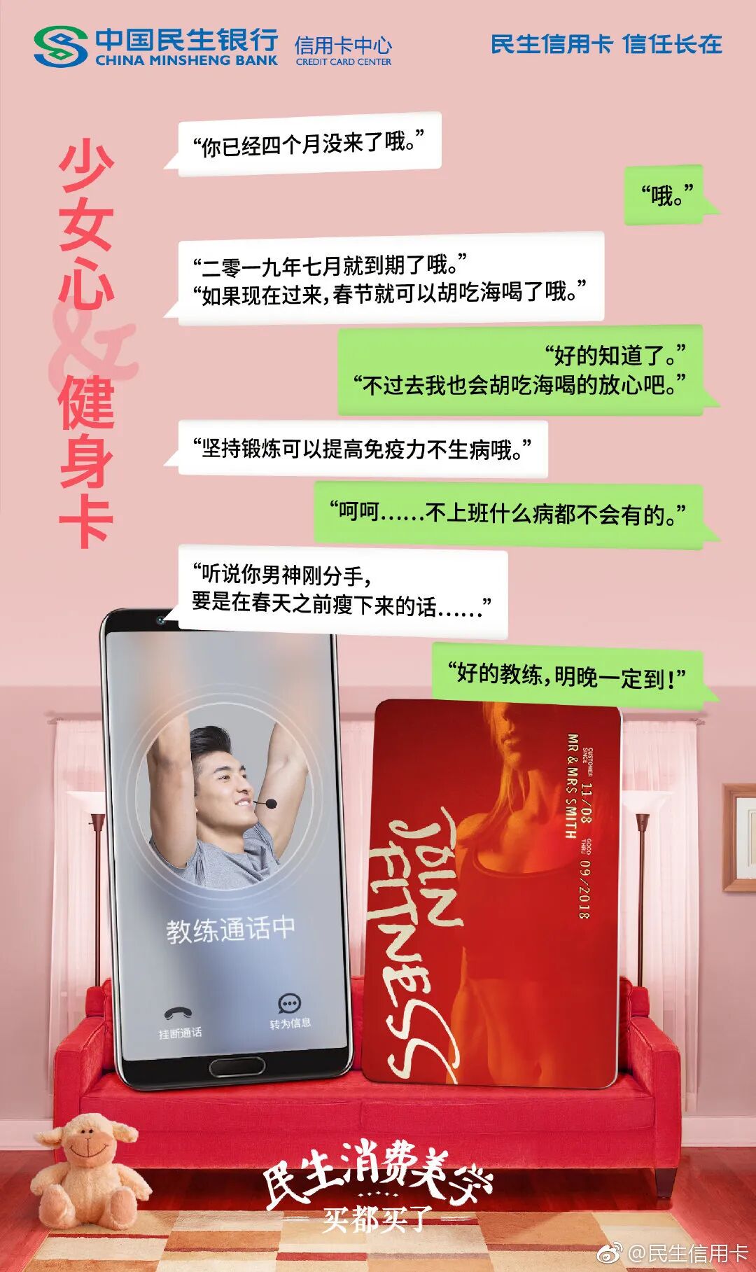 在“买都买了”的主题海报中,民生信用卡就构建逼真的微信对话模板,毫不经意的聊天内容,却植入了消费美学的价值,赚钱是做自己喜欢的事情,办健身卡是成就更好的自己。