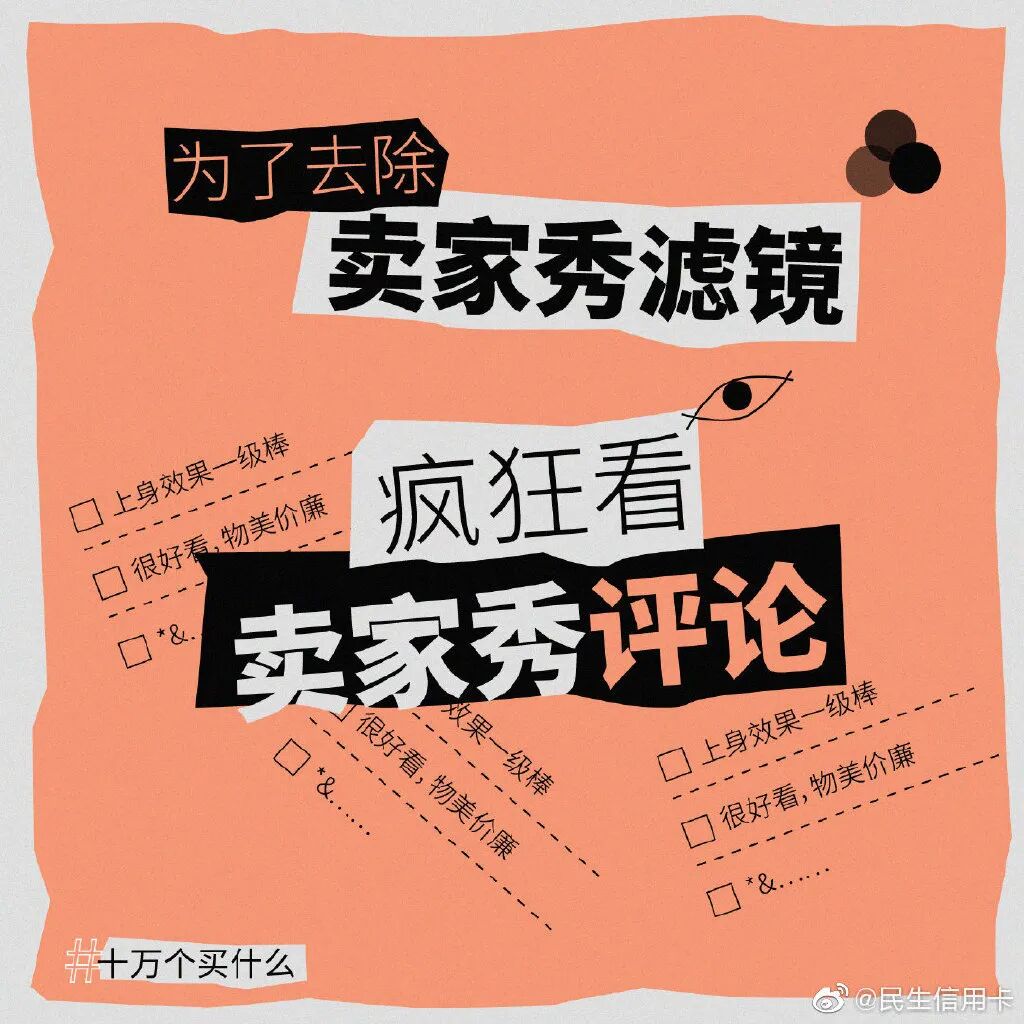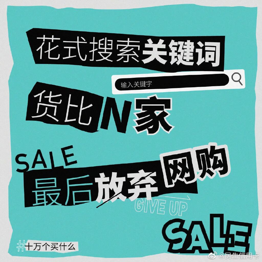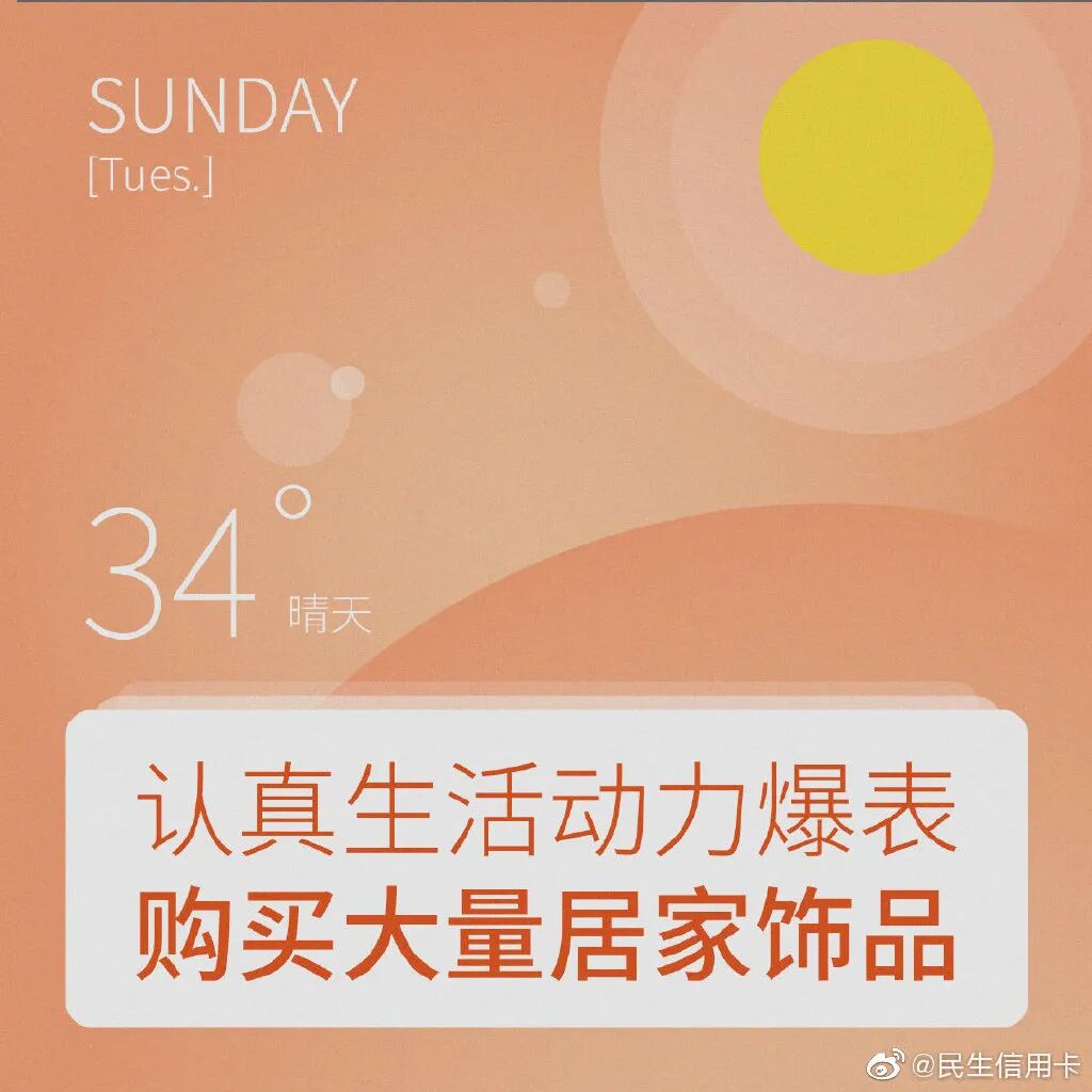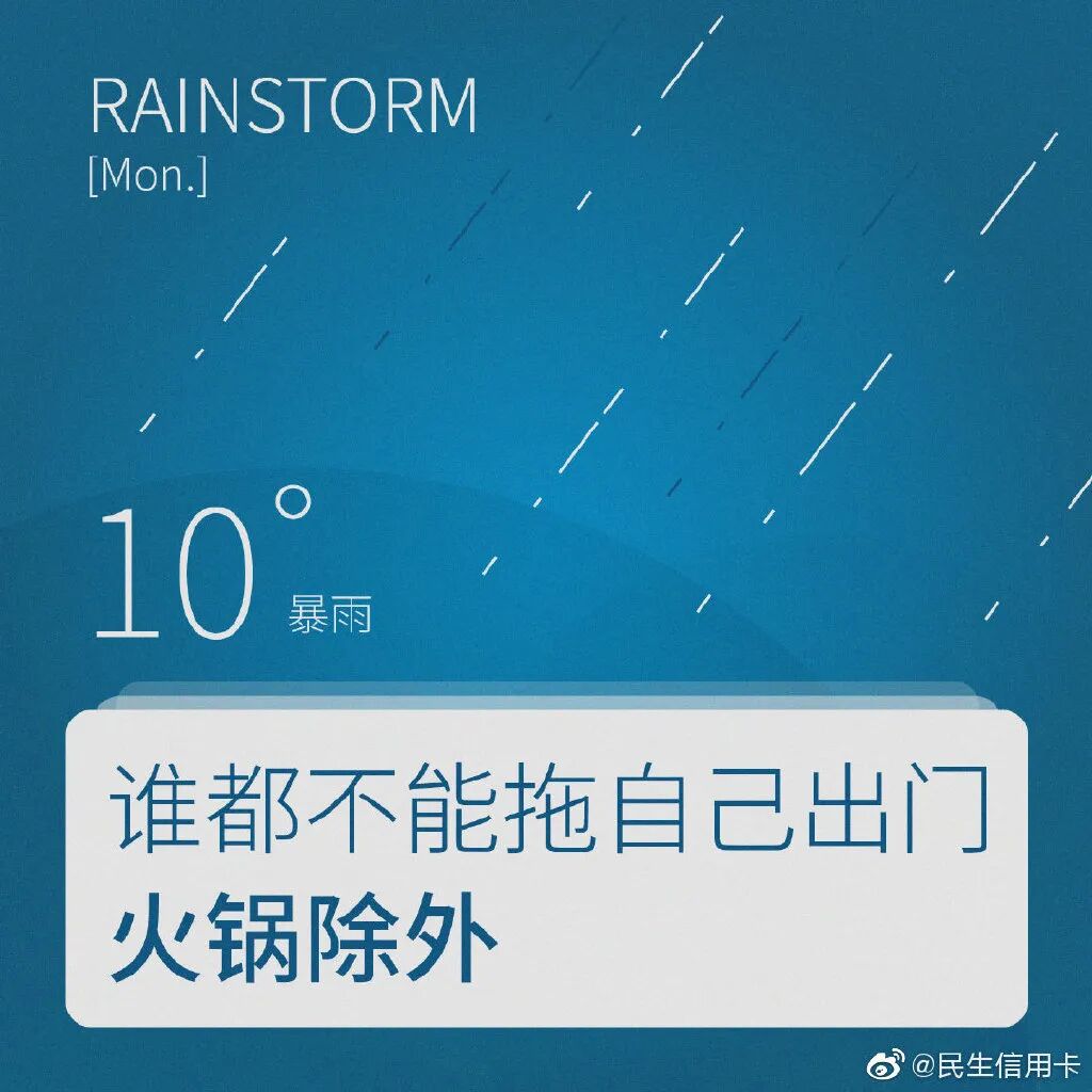 民生信用卡还发起#十万个买什么#的话题,从天气、网购等不同的视角呈现你的生活缺点什么,潜移默化告诉你买东西的N个理由。毕竟只要在消费,人生一切都值得。透过天气看穿你的下单人格,无论天晴或下雨,能下单就是好天气。比如,揭穿你疯狂剁手时那些时间黑洞:看买家评论、加载购物车.....