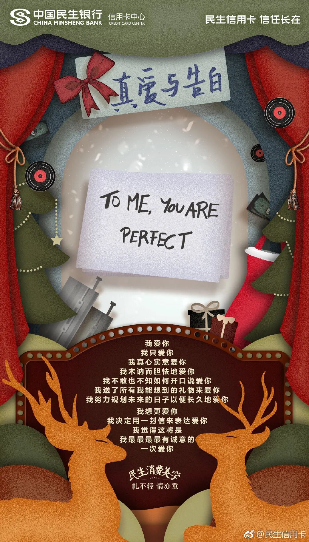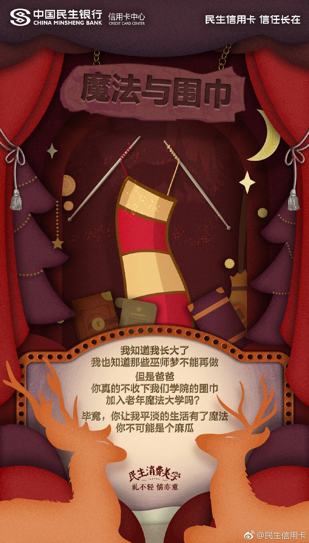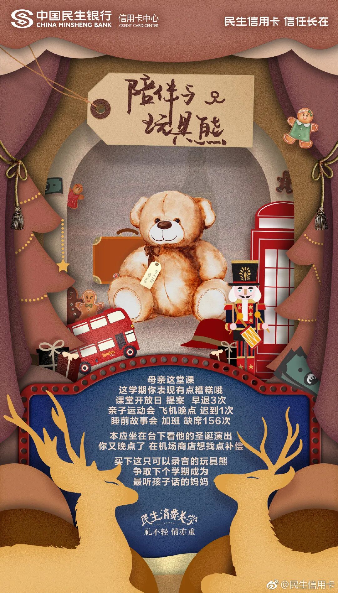 提及圣诞节,总会让人联想到圣诞节的相关元素——减法、围巾、玩具熊等,民生信用卡同样曾用圣诞节场景的元素,含蓄表达了圣诞节送礼的意义。
