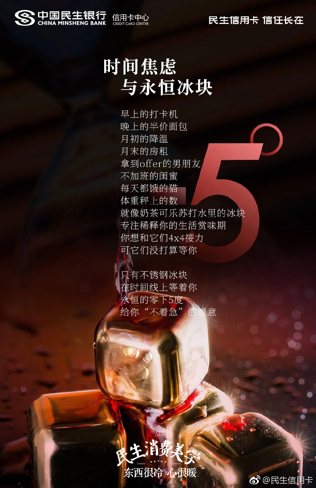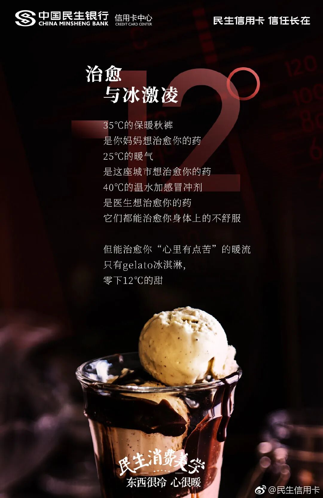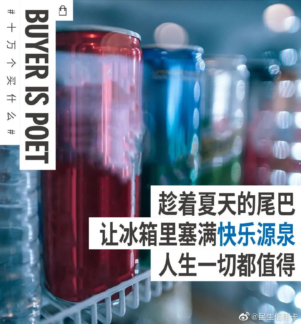 用好了冷暖对比文案沟通手法,文案就会更具画面感。民生信用卡戳中当下年轻人焦虑、加班等日常痛点,将冷冰冰的摄氏度温度,加入了撸火锅、吃冰激凌的生活画面,形成了鲜明对比。民生信用卡这时期望用冰点温度故事,安抚年轻人内心的焦虑和不安情绪。让人不自觉感受到,适当的给自己加点小确幸的消费,也是一种给自我心灵降温的方式。看似冰点的温度,其实都是热情生活的沸点,传递了民生信用卡的品牌温度。