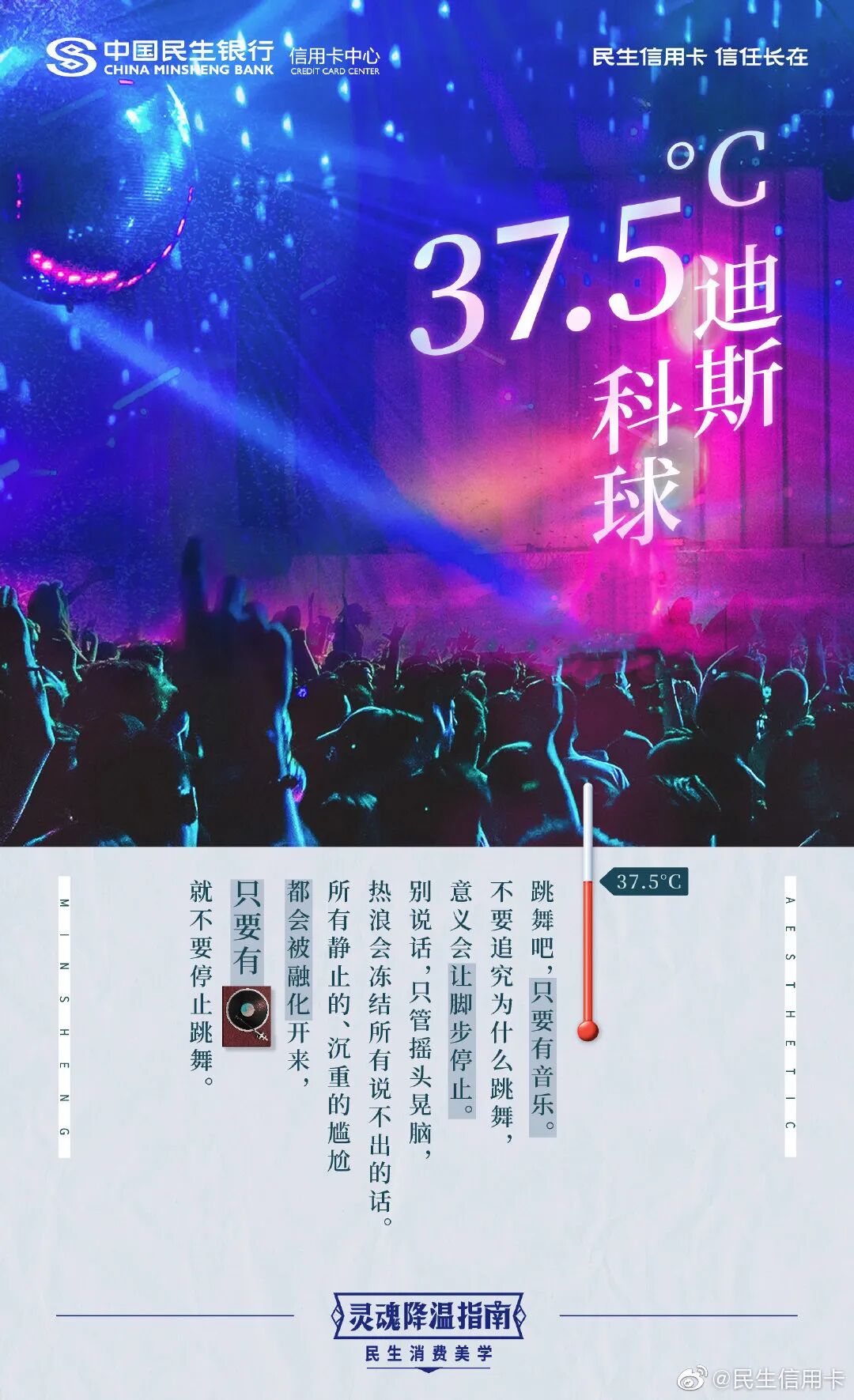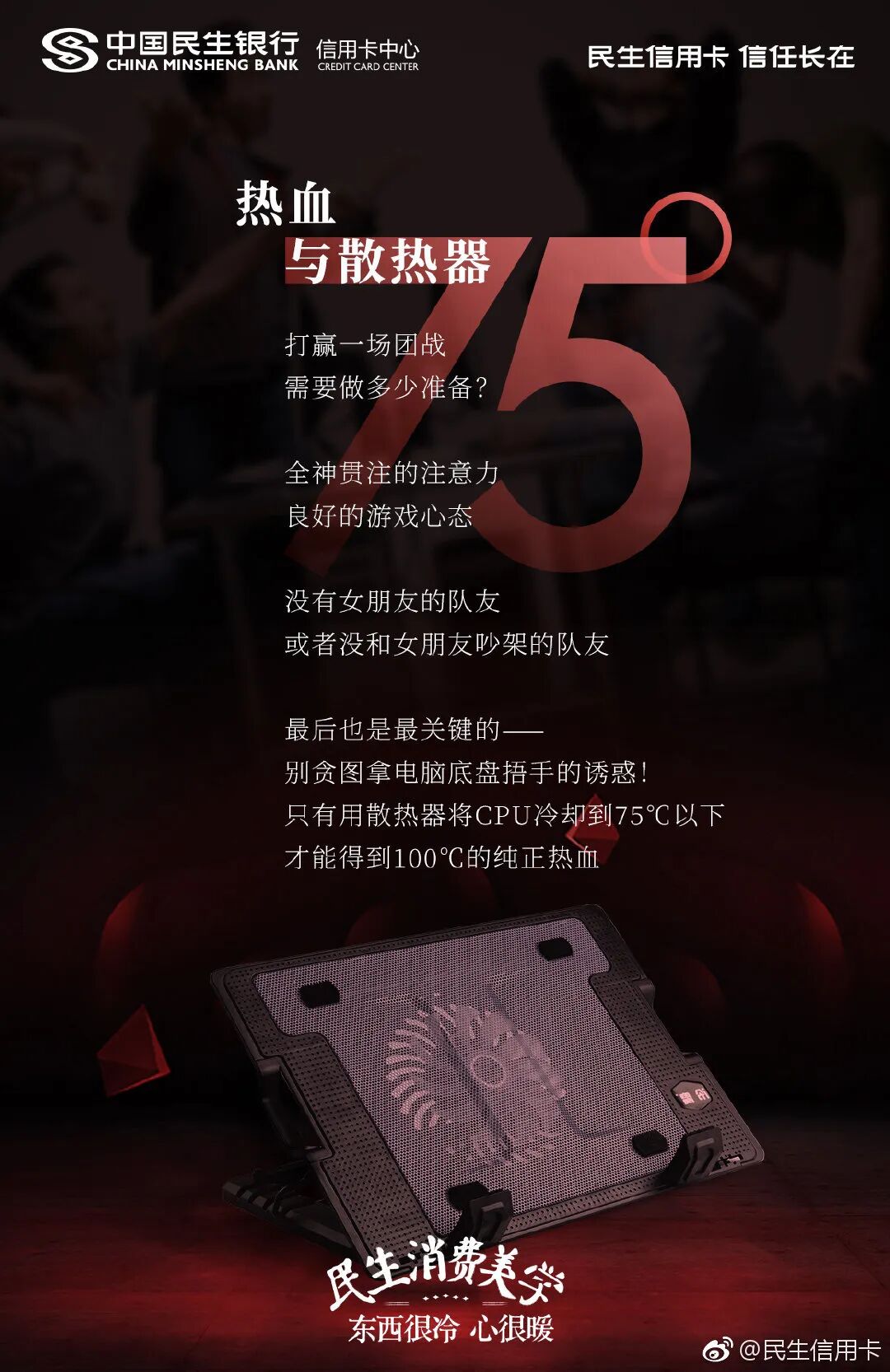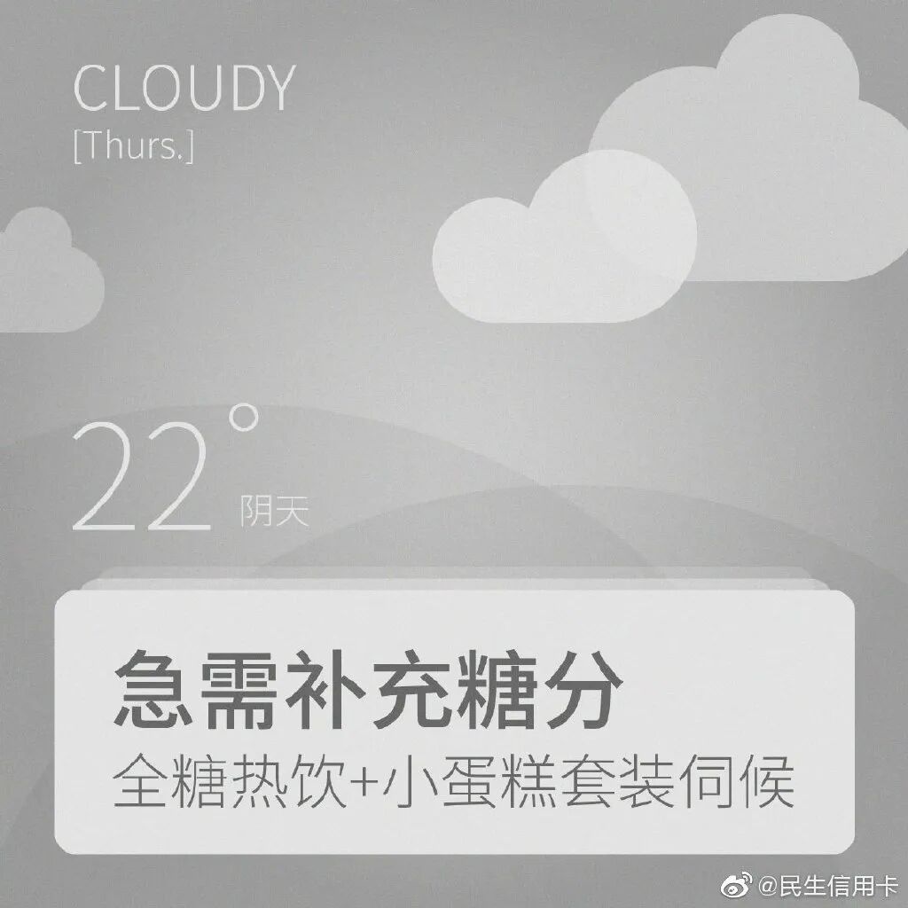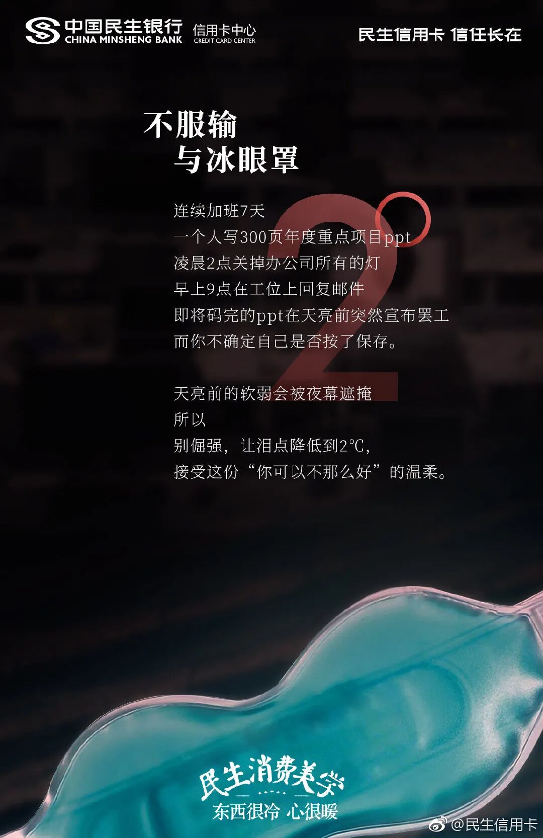 用好了冷暖对比文案沟通手法,文案就会更具画面感。民生信用卡戳中当下年轻人焦虑、加班等日常痛点,将冷冰冰的摄氏度温度,加入了撸火锅、吃冰激凌的生活画面,形成了鲜明对比。民生信用卡这时期望用冰点温度故事,安抚年轻人内心的焦虑和不安情绪。让人不自觉感受到,适当的给自己加点小确幸的消费,也是一种给自我心灵降温的方式。看似冰点的温度,其实都是热情生活的沸点,传递了民生信用卡的品牌温度。