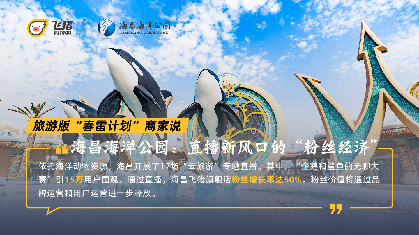 4月24日飞猪发布旅游版“春雷计划”,将结合阿里巴巴经济体多端多场景的优势,除了把订单带给商家,还将帮助商家提升线上运营效率,沉淀粉丝、增加会员、提升品牌,全年将举办137场主题营销活动,打造100个标杆商家。