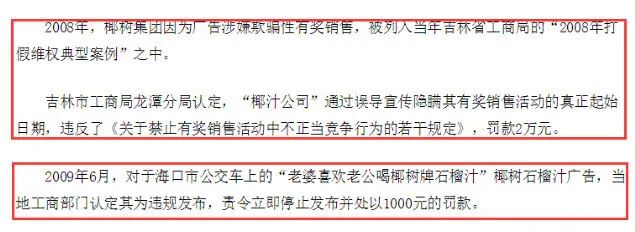 2019年,椰树椰汁还因为涉嫌虚假宣传“丰胸”功能等,被工商部门立案调查,最终认定其广告妨碍社会公共秩序或者违背社会良好风尚,行政罚款20万元。