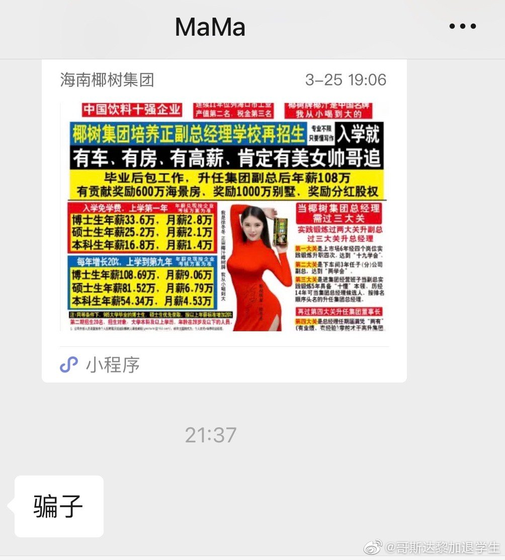 说到这里,我真的是对椰树椰汁有隐隐的担心。因为虽然椰树椰汁这么多年来在舆论压力下,一直坚持住了自己的宣传风格,但也无异于在雷区蹦迪,一不小心就玩脱了。就说去年引发全网热议的招生条件,要求应聘者一要承诺做到“两不”:忠诚不谋私,顾事业不顾家;二要承诺终身在“椰树”服务,承诺以房产作抵押,离开“椰树”以房产偿还。