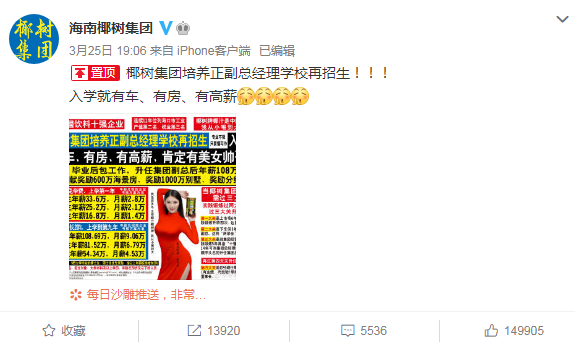 面对网友们的疯狂调侃,椰树椰汁也站出来回应了,说自己本意就是为了招生,不存在炒作,只是坚持了自己的宣传风格。