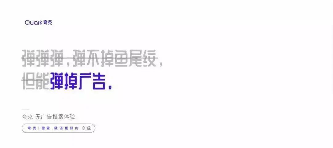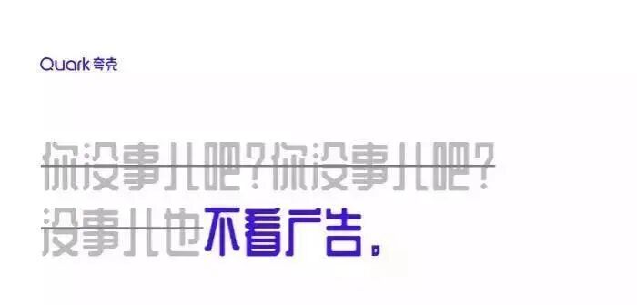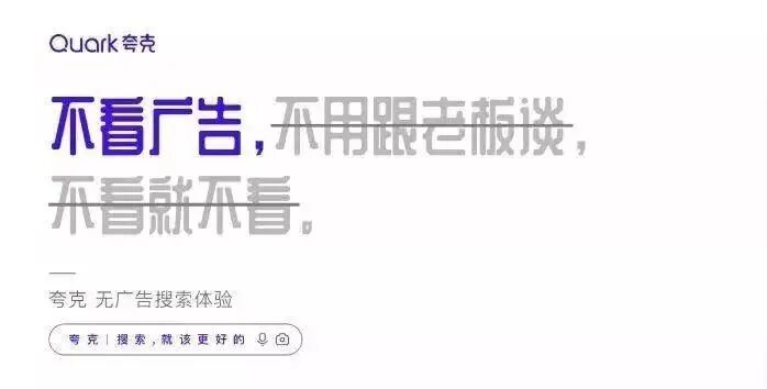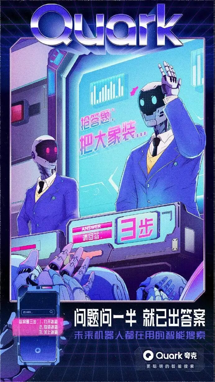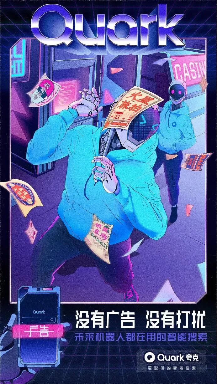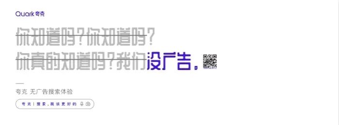 看完视频,是不是感觉被喂了一把恋爱酸臭味的狗粮呢?不得不说,夸克套路太深了。通过机器人谈恋爱的5个系列场景,突出了夸克「拍照搜题」、「卡路里识别」、「拍照翻译」等智能搜索功能。夸克用AI打开恋爱的正确方式,完成了产品功能特点植入,成功抢占用户心智,给受众留下了深刻的品牌印象。为了增加传播效果,夸克还发布了一组同系列的视觉设计海报,更加直观提炼出产品的核心卖点。这组充满未来科技感的赛博朋克风海报,色彩鲜明,复古炫酷,营造了强烈的视觉冲击力效果。文案体现出夸克对用户诉求的深度洞察,针对用户对于目前搜索软件存在的痛点问题,一一给出解答方案,展现了产品的有效竞争力,强化用户对夸克品牌定位的认知。并且,夸克虚拟了来自3001年的场景,以一个关于「未来」夸父的故事,链接了当下与未来的时空对话,创造与年轻群体沟通的新语境,有助于激发用户的共鸣,博取品牌认同感。近年来,夸克凭借「没有广告」的理念主张,成功在智能搜索APP的红海里杀出重围,赢得了大众的口碑和喜爱。虽然一向自我标榜没有广告,但夸克其实一直很擅长为自己打广告,可谓是真正的反向营销鬼才。在机场、地铁、电梯等投放场所,以“无广告搜索体验”为主题,把各大知名品牌的洗脑广告语diss一番,只留下「不看广告」的字眼,为自己正名。此次大胆的投放吸引了大量行人的驻足参观,纷纷自发拍照分享至社交网络平台上,让夸克「没有广告」理念深入人心。初步建立起了用户对夸克APP独特优势的印象,赚足了传播声量,真正实现了刷屏式出圈,实属为一次成功的营销案例。疫情期间,众多品牌用自己的声音援助抗疫,夸克也不例外。夸克用浏览器搜索框的形式,发布「问的力量」系列海报。