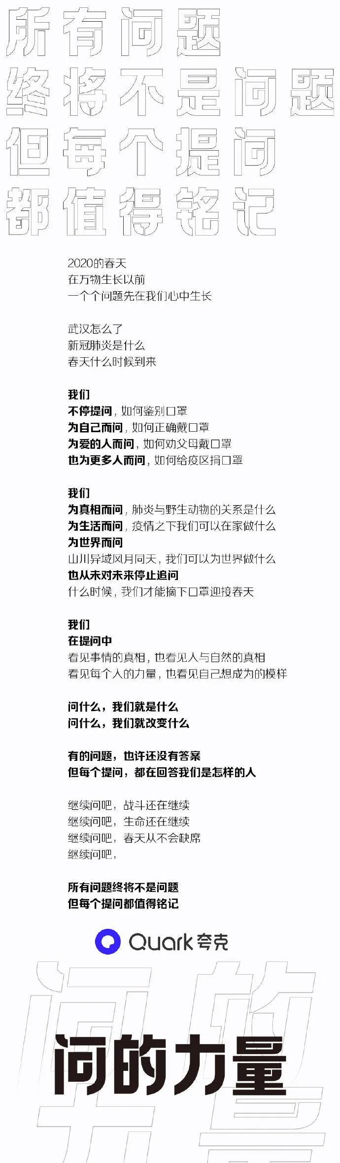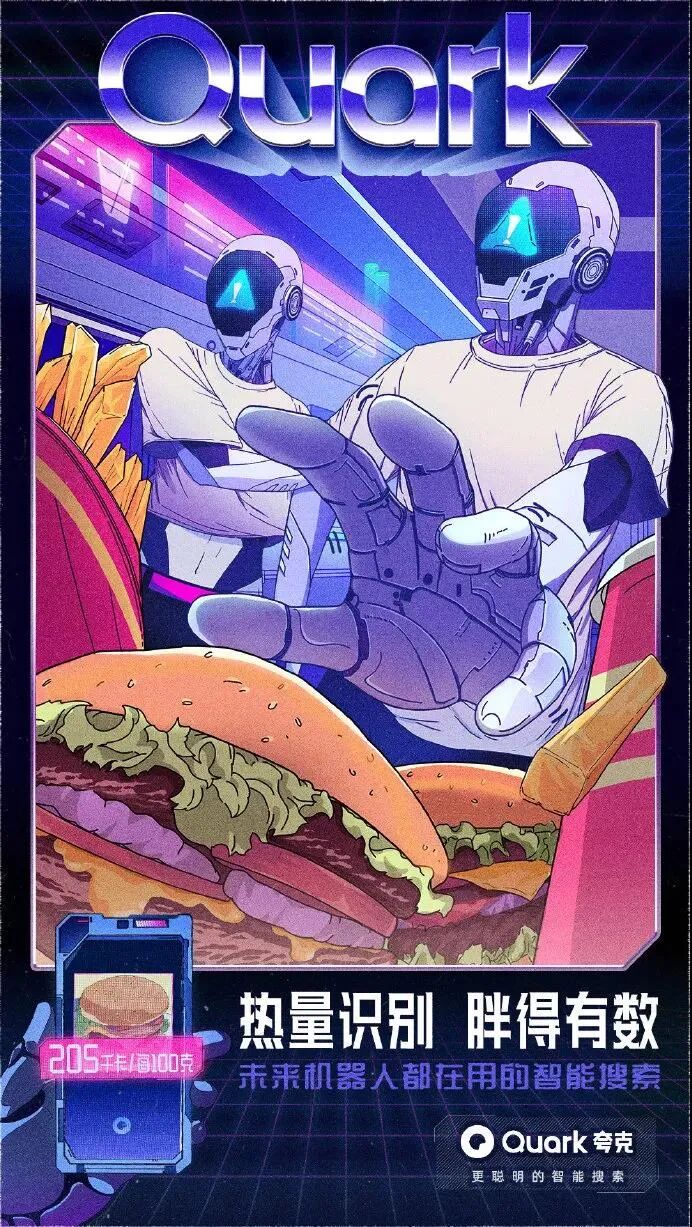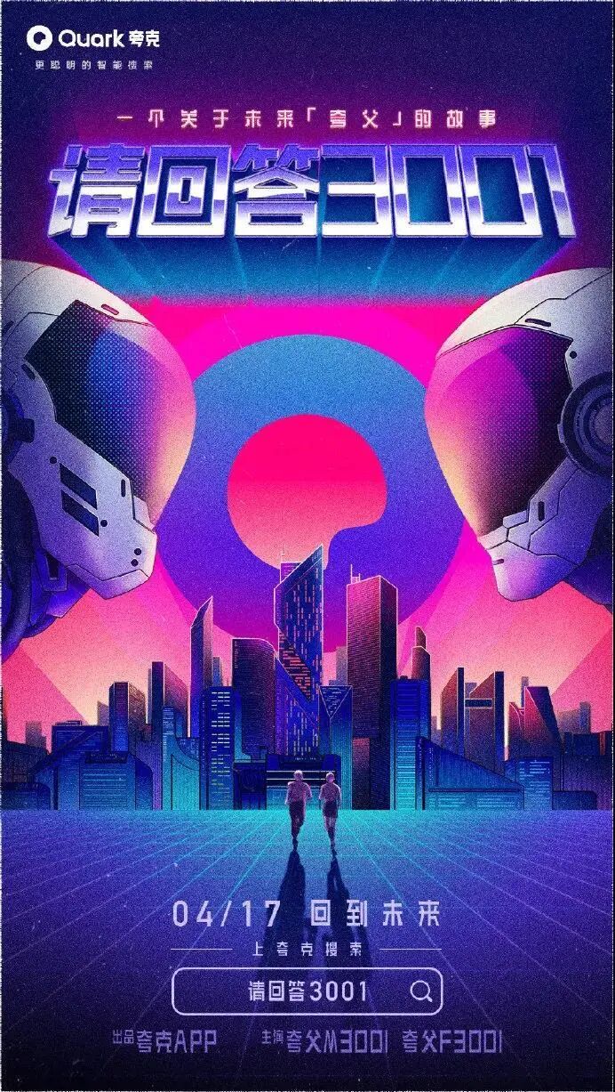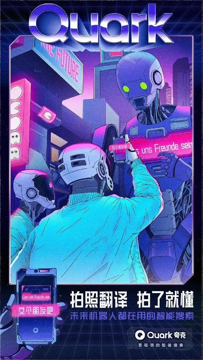 看完视频,是不是感觉被喂了一把恋爱酸臭味的狗粮呢?不得不说,夸克套路太深了。通过机器人谈恋爱的5个系列场景,突出了夸克「拍照搜题」、「卡路里识别」、「拍照翻译」等智能搜索功能。夸克用AI打开恋爱的正确方式,完成了产品功能特点植入,成功抢占用户心智,给受众留下了深刻的品牌印象。为了增加传播效果,夸克还发布了一组同系列的视觉设计海报,更加直观提炼出产品的核心卖点。这组充满未来科技感的赛博朋克风海报,色彩鲜明,复古炫酷,营造了强烈的视觉冲击力效果。文案体现出夸克对用户诉求的深度洞察,针对用户对于目前搜索软件存在的痛点问题,一一给出解答方案,展现了产品的有效竞争力,强化用户对夸克品牌定位的认知。并且,夸克虚拟了来自3001年的场景,以一个关于「未来」夸父的故事,链接了当下与未来的时空对话,创造与年轻群体沟通的新语境,有助于激发用户的共鸣,博取品牌认同感。近年来,夸克凭借「没有广告」的理念主张,成功在智能搜索APP的红海里杀出重围,赢得了大众的口碑和喜爱。虽然一向自我标榜没有广告,但夸克其实一直很擅长为自己打广告,可谓是真正的反向营销鬼才。在机场、地铁、电梯等投放场所,以“无广告搜索体验”为主题,把各大知名品牌的洗脑广告语diss一番,只留下「不看广告」的字眼,为自己正名。此次大胆的投放吸引了大量行人的驻足参观,纷纷自发拍照分享至社交网络平台上,让夸克「没有广告」理念深入人心。初步建立起了用户对夸克APP独特优势的印象,赚足了传播声量,真正实现了刷屏式出圈,实属为一次成功的营销案例。疫情期间,众多品牌用自己的声音援助抗疫,夸克也不例外。夸克用浏览器搜索框的形式,发布「问的力量」系列海报。