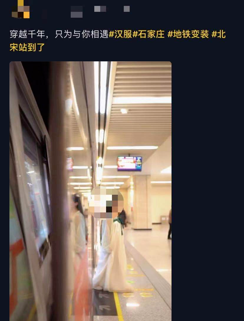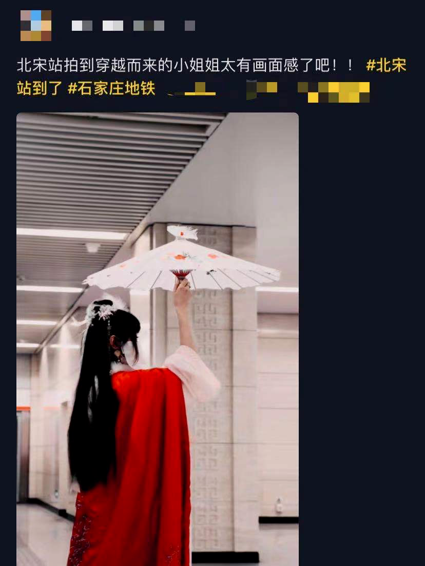 爆火的原因很简单,不是因为其拥有精致的装潢,也不是官方出色的营销策划,而仅仅就是因为它的名字——随意点开某音,都能发现北宋站的身影,清一色的表演内容充斥眼前喜爱古风的小姐姐和小哥哥,在车厢内身穿日常便装,走出站门完成瞬间变装,通过剪辑的方式上演着大型的穿越戏码。唯美唯俏的古风装扮,配上北宋的地铁站名,制造出一种前世古人穿越千年,从地铁里徐徐走下来的震撼视觉反差,让人眼前一亮。