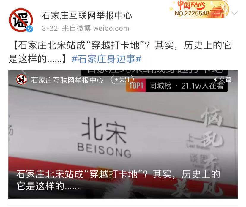 为了缓解这种盲目跟风打卡的局面,石家庄互联网举报中心还亲自出来辟谣,科普地铁北宋站的起名来源。据史料和水文地质勘探证明,北宋的名字来源于古运粮河,货物水运至此,再向北送往真定城,故名“北送”,后谐音变为北宋