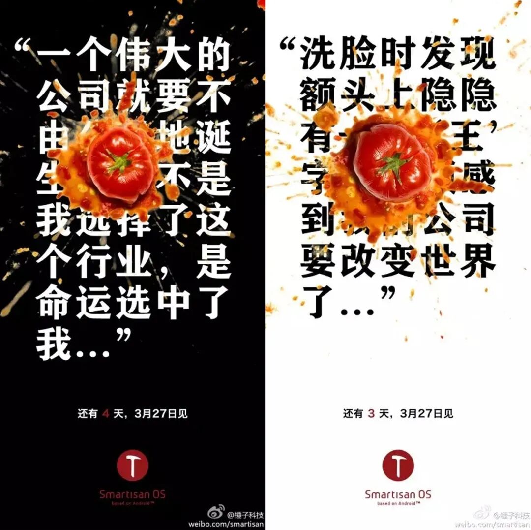 比如最早的“Smartisan OS 发布会”,吹牛式的文案,搭配砸烂番茄的效果,半自夸半自嘲,这感觉就很戏剧。