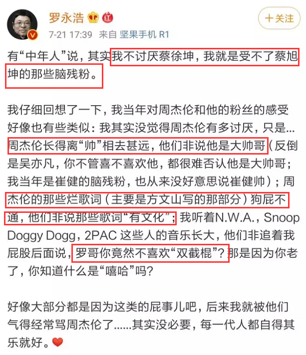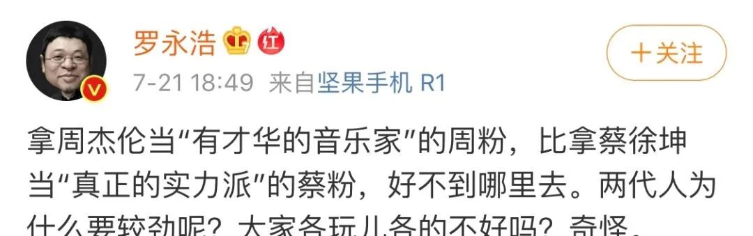 当年周杰伦吊打蔡徐坤登顶微博超话第一,罗永浩就“周杰伦超话”事件发博,称周杰伦长得不帅却被粉丝称帅哥;除了攻击长相,还吐槽周杰伦歌曲歌词为“烂歌词”。树大招风,枪打出头鸟。