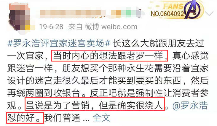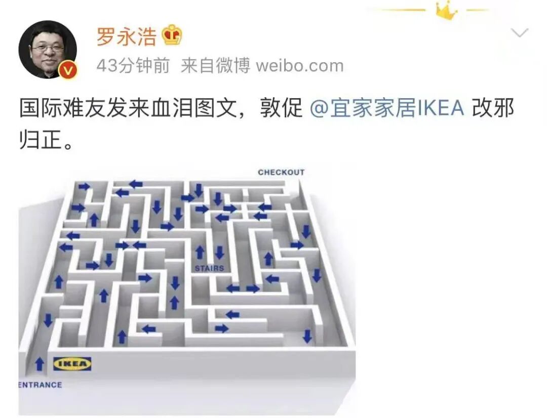 宜家的迷宫卖场营销的就是体验式消费,但在罗永浩看来似乎不太友好,老罗也曾一口气发了百条微博声讨宜家。起因是罗永浩带着老太太去宜家购物,无法用最短线路离开,于是上微博怼宜家迷宫般的卖场设计,更是cue了宜家改邪归正。不过透过网友的响应,罗永浩似乎也说出了大家的心声。星巴克不卖小杯是出于提高客单价考量,但老罗认为星巴克把消费者当傻X。