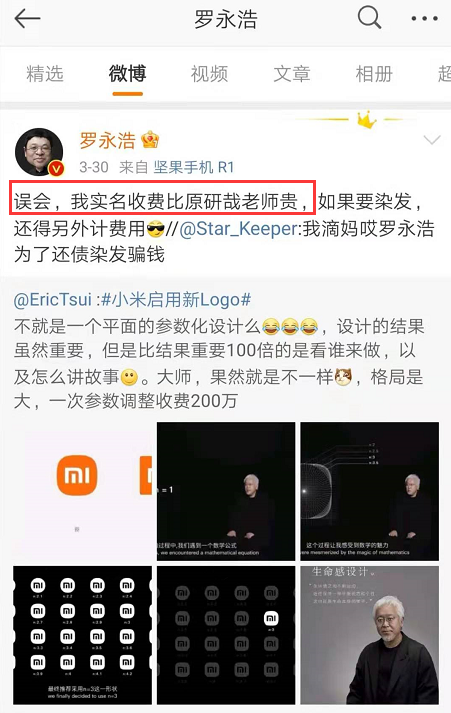 有网友把设计师原研哉看成罗永浩,误以为老罗为改行去做设计了。罗老师也没闲着,趁机站出来借势:实名收费比原研哉老师还要贵。