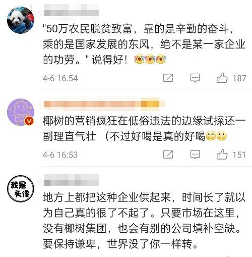椰树集团的自辩长文通篇“回怼”“扣帽子”,捆绑50万农民群体,还扯上海南形象,实在匪夷所思。50万农民脱贫致富,靠的是辛勤的奋斗,乘的是国家发展的东风,绝不是某一家企业的功劳。海南的形象,也绝不是一家惯于“低俗营销”的企业能代表的。椰树集团与其费尽心思诡辩,不如好好反思;与其担心惨状再现,不如提升口碑。同时称椰树牌椰汁的确是好饮料,守住品质,别让低俗营销砸了招牌。
