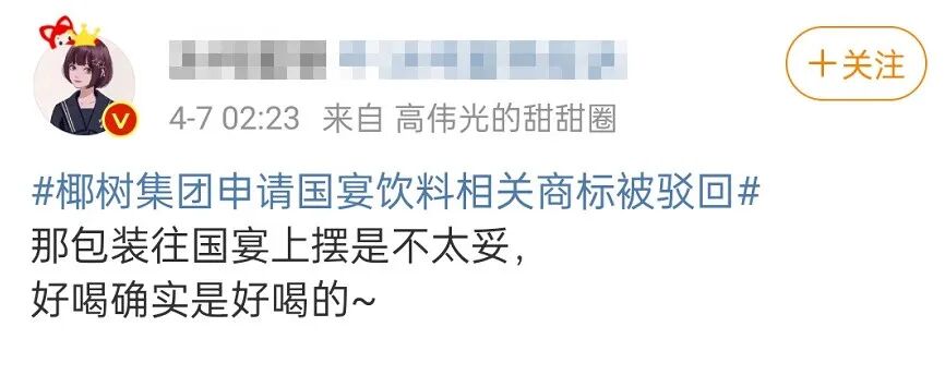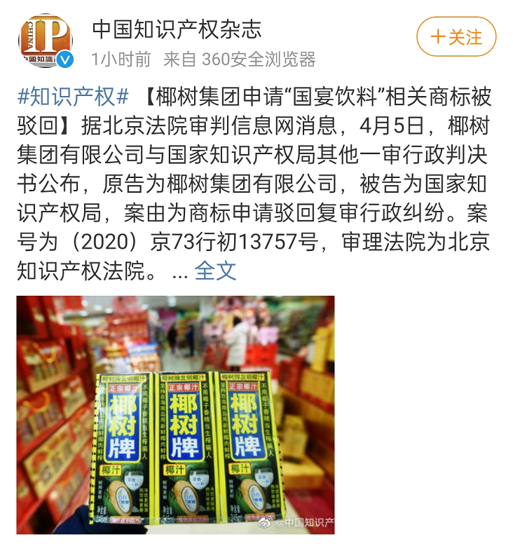 椰树于2019年申请了“椰树YeShu Coconut China State Banquet Beverage”商标,翻译过来就是“椰树椰子中国国宴饮料”,但被驳回。