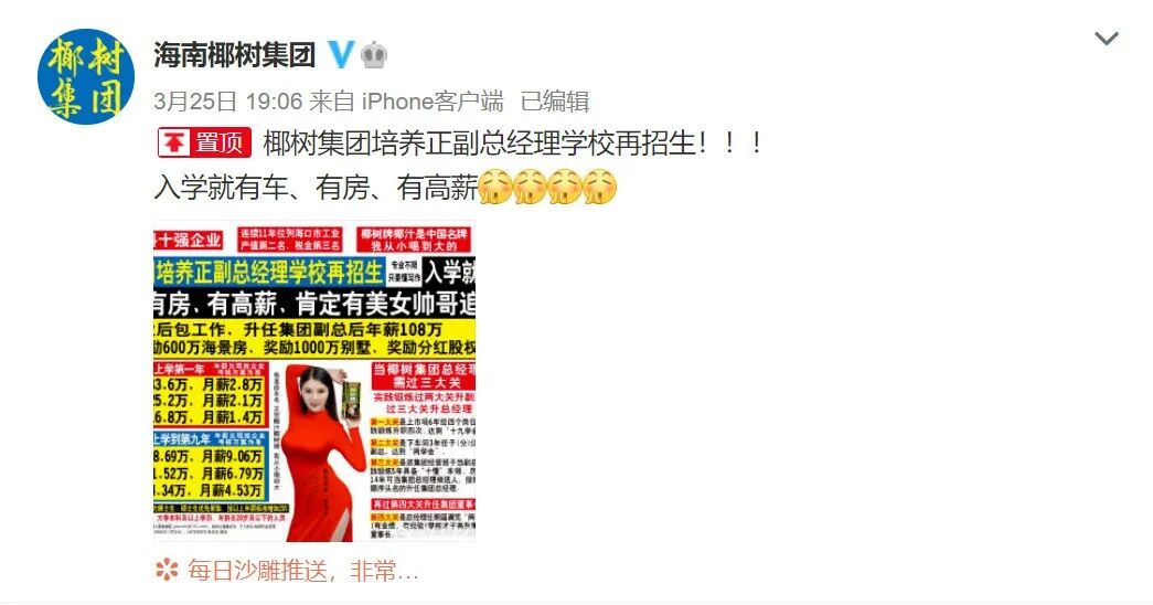 事情的起因我们再来回顾下,3月25日,椰树集团在其官博发送了一条招聘广告。简单粗暴的文案,黑黄红的经典配色,还在突出位置放置了代言人徐冬冬呈S型站姿、手持椰树牌椰汁的照片。这样的招聘海报让人看到的时候一度怀疑是街头骗子小广告,内容涉嫌虚假宣传。