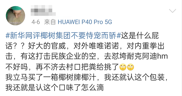 在椰树集团发布了长文之后,新华网也坐不住了,批评椰树集团不要恃宠而骄,《匪夷所思,椰树集团哪里来的傲气?!》新华网称椰树牌椰汁深受消费者喜爱,也是知名国产饮料品牌,但这绝不是椰树集团可以恃宠而骄的资本。